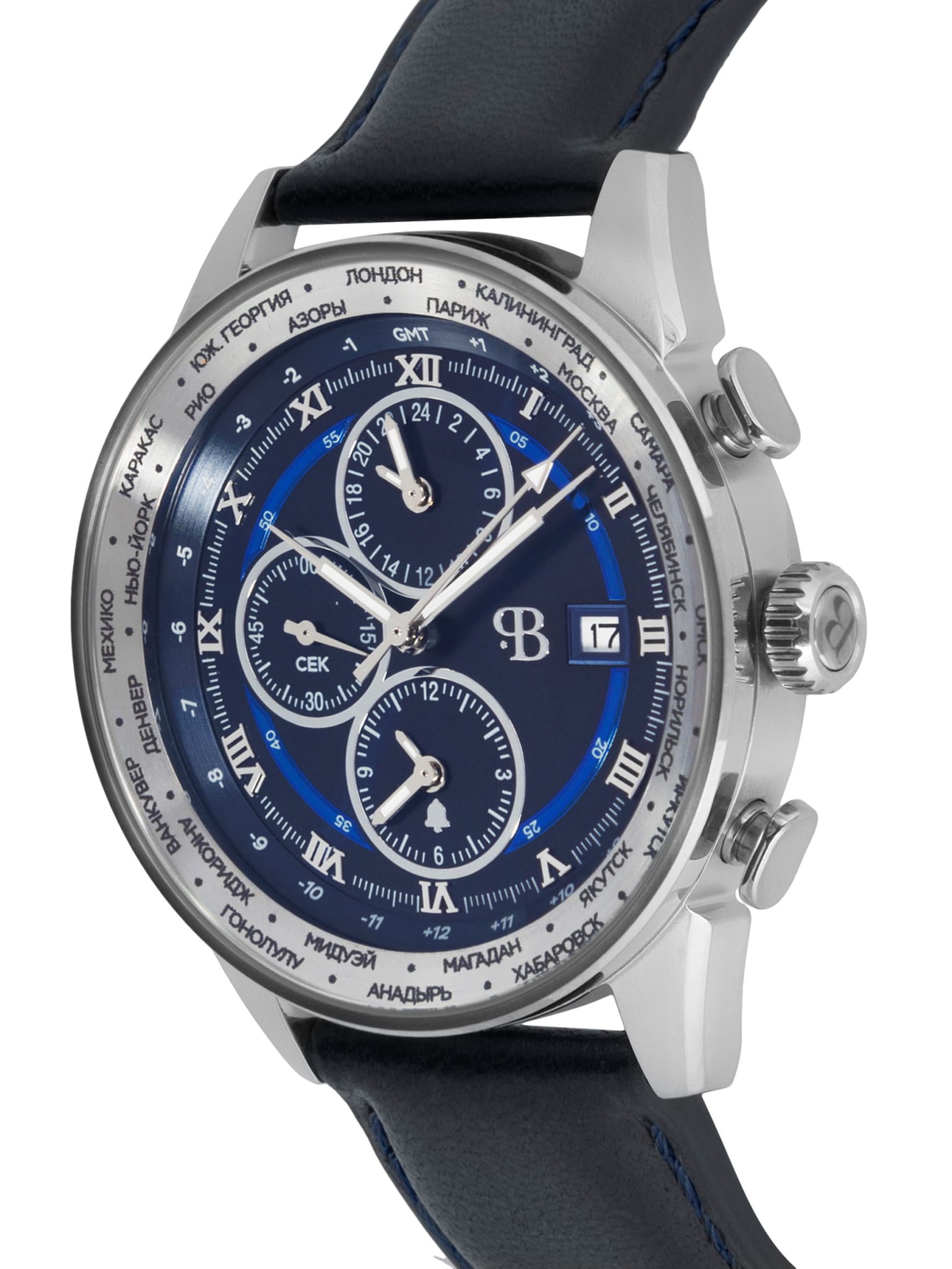 Российские часы Русское время c хронографомХронографФункция позволяет измерять отрезки времени с особой точностью: часы, минуты, секунды. Верным признаком хронографа является наличие на циферблате 3 дополнительных окошек-счётчиков. 75170753 оснащены кварцевый механизм, что обеспечивает исключительную надежность и точность хода. Корпус часов выполнен из стали, что придает ему долговечность и устойчивость к внешним воздействиям Минеральное стеклоМинеральное стеклоМинеральное стекло представляет собой искусственно выращенный минерал кварца. Такое стекло отличается особой устойчивостью к повреждениям и царапинам. Уступает по некоторым качествам сапфировому стеклу. устойчиво к мелким механическим повреждениям, что гарантирует долговечность и сохранение первоначального вида. Класс водозащиты часов составляет 50 метров, что позволяет защитить корпус от случайных брызг и капель дождя.Кожаный ремешок на стандартной застежке. Эти часы идеально подойдут для повседневного использования, сочетая в себе стиль, надежность и функциональность. Лимитированная серия.