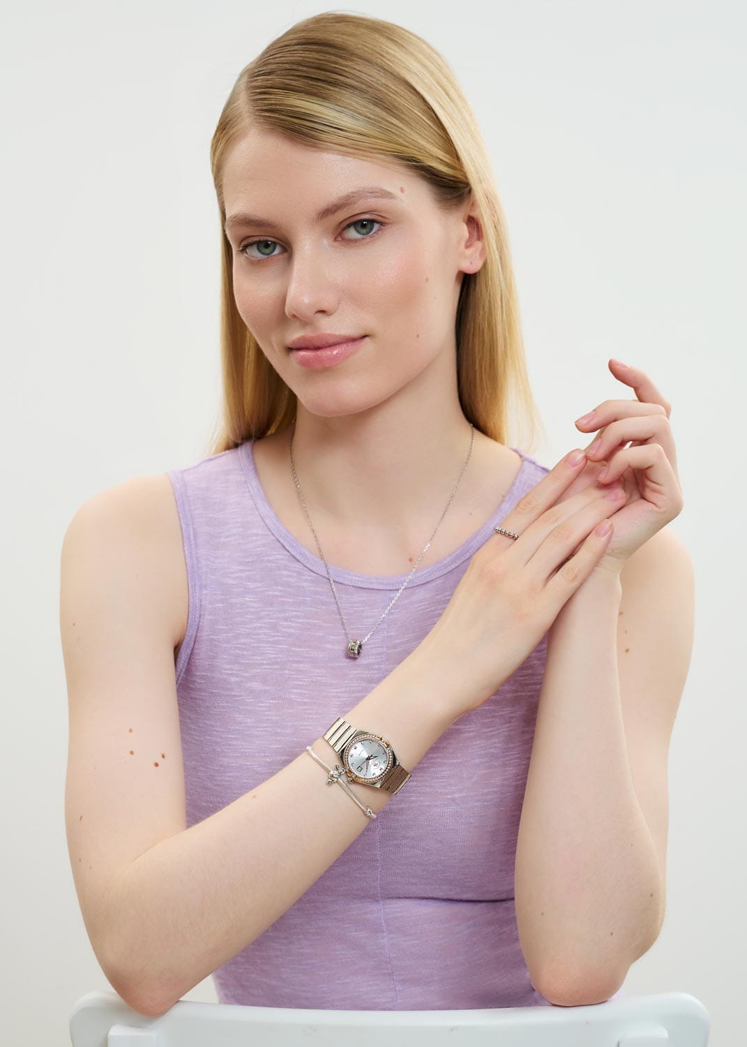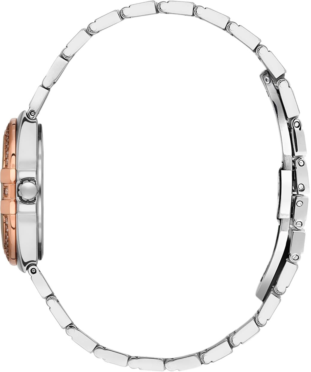 Женские кварцевые часы Santa Barbara Polo & Racquet Club — это элегантный аксессуар для тех, кто ценит утончённый дизайн и стильные детали. Корпус диаметром 30 мм выполнен из нержавеющей стали 316L. БезельБезельВнешний ободок, закрепляющий стекло. В спортивных часах так называется поворотное кольцо с делениями на циферблате, выполняет роль таймера – замеряет отрезки времени на шкале. Неподвижный безель – элемент декора. Однонаправленно вращающийся безель на дайверских часах позволяет фиксировать моменты погружения и выныривания на поверхность. с частичным IP-покрытиемIP-покрытиеМетод ионного напыления. Демонстрирует повышенную устойчивость к истиранию, окислению и химическим веществам. Под воздействием высокого давления и температуры около 1500°C молекулы металла надёжно соединяются с частицами корпуса часов. розового золота, с полированной отделкой, украшен кристаллами. Циферблат серебристого цвета оформлен по технологии Sunray («солнечные лучи»), дополнен накладными метками в виде точек, инкрустированных кристаллами, и фирменным логотипом. Окошко даты расположено в положении 3 часов. Стрелки клиновидной формы, в стиле Dauphine, с люминесцентным покрытиемЛюминесцентное покрытиеПозволяет считывать показания времени в темноте. Производители наносят на стрелки, часовые индексы, безель или поверхность циферблата светонакопительный состав, дающий холодное свечение., обеспечивающим хорошую читаемость в темноте. Циферблат защищён минеральным стеклом. Часы оснащены стальным браслетом с частичным IP-покрытиемIP-покрытиеМетод ионного напыления. Демонстрирует повышенную устойчивость к истиранию, окислению и химическим веществам. Под воздействием высокого давления и температуры около 1500°C молекулы металла надёжно соединяются с частицами корпуса часов. и застёжкой «бабочка» с кнопкамиЗастёжка "бабочка"Такой вид застёжки дополняется предохранителями, помогающими избежать случайного раскрытия браслета. Обладают изящным исполнением. . Водонепроницаемость 50 м позволяет использовать часы в повседневных условиях. Идеальный выбор для тех, кто ценит изысканность, блеск и качество.