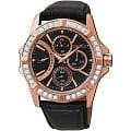 Наручные японские женские часы. Круглый корпус часов выполнен из стали с полным PVD покрытием золотого цвета. Черный фон циферблата и золотые элементы дизайна. Водонепроницаемость 3 ATM. Минеральное стекло, устойчивое к появлению царапин. Часы прочно удерживаются на руке ремешком из натуральной кожи. Часы украшены кристаллами Swarovski. Современный и роскошный аксессуар.