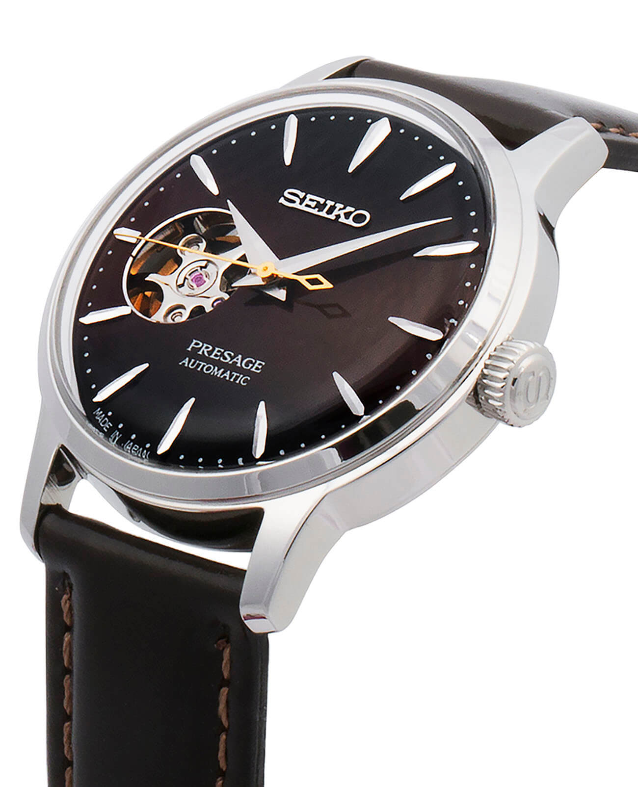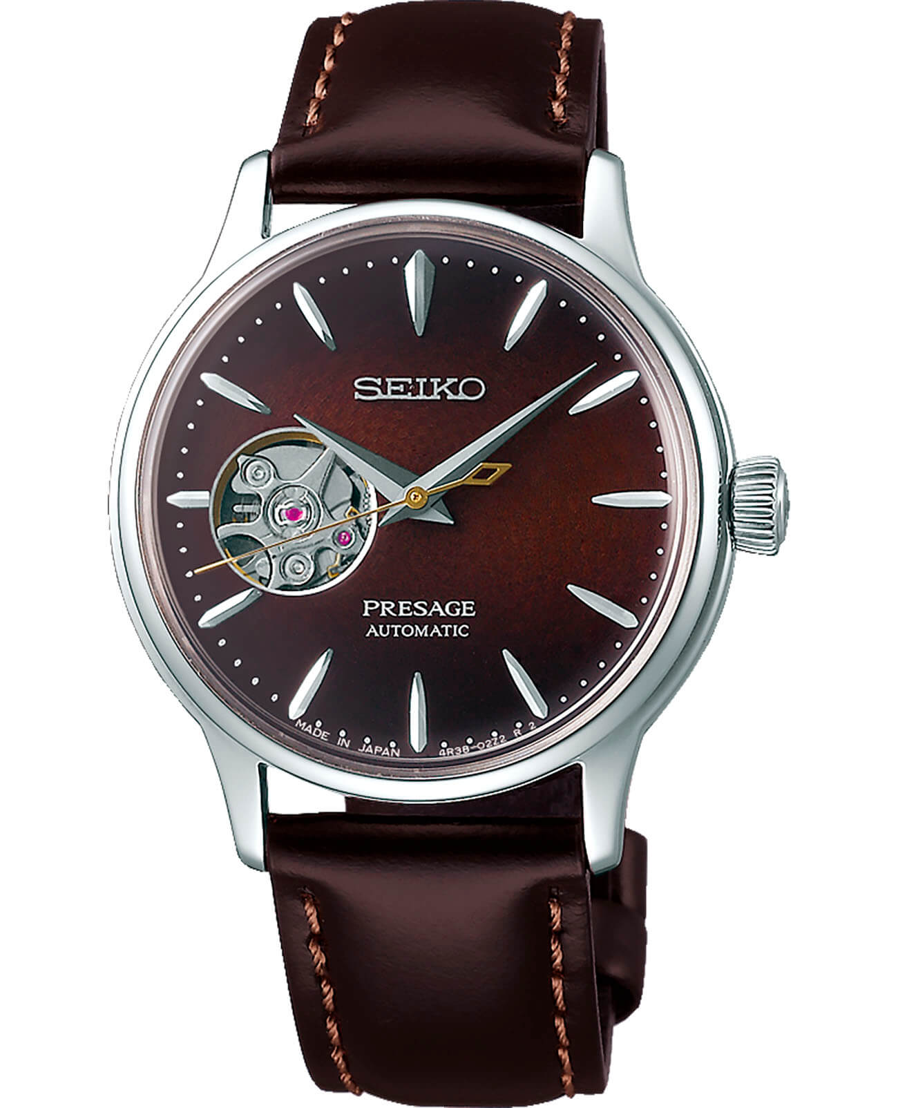Модель – парный вариант мужских часов Seiko SSA407J1. Аксессуар наделён стильным циферблатом с элегантным узором. Скелетонизированная модель дополнена круглым окошком на метке 9 часов, что позволяет наблюдать за перемещением деталей. Этому способствует и прозрачная задняя крышка, выставляя напоказ работу японского автоматического механизма Seiko 4R38 с запасом хода 40 часов. Функция «stop-second» предоставляет возможность остановить часовой механизм для регулировки времени с точностью до секунды. Ремешок изготовлен из натуральной кожи. Циферблат защищён прочным минеральным стеклом Hardlex, устойчивым к царапинам. Диаметр корпуса: 33,8 мм.