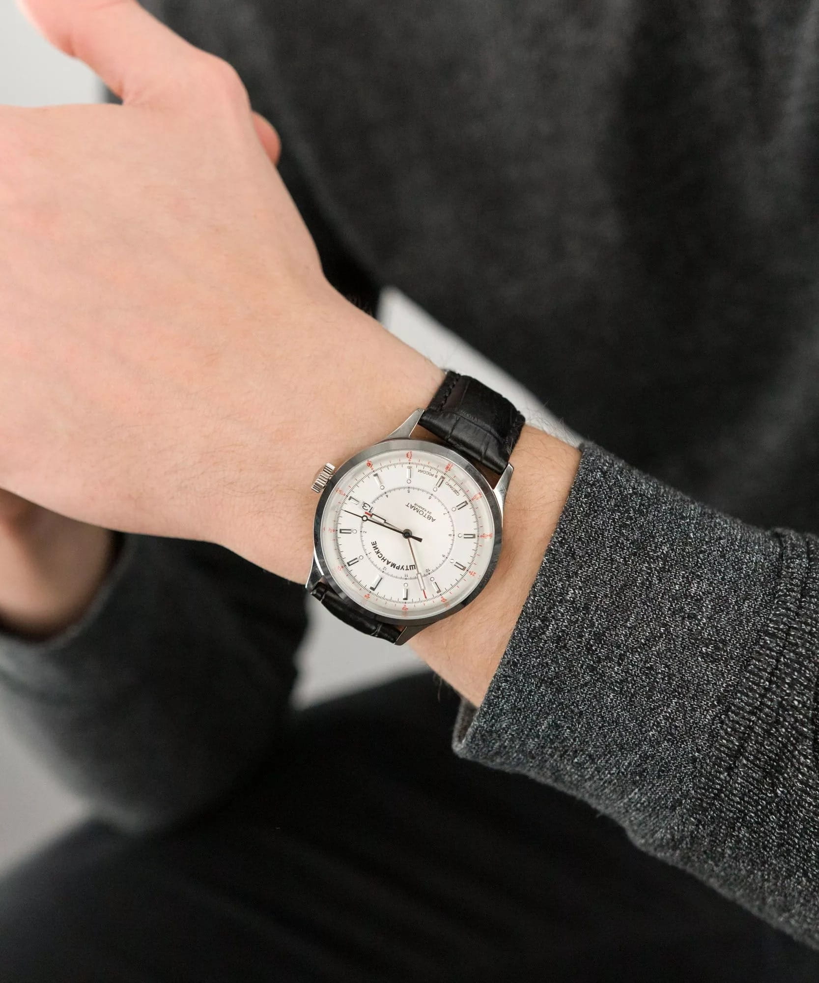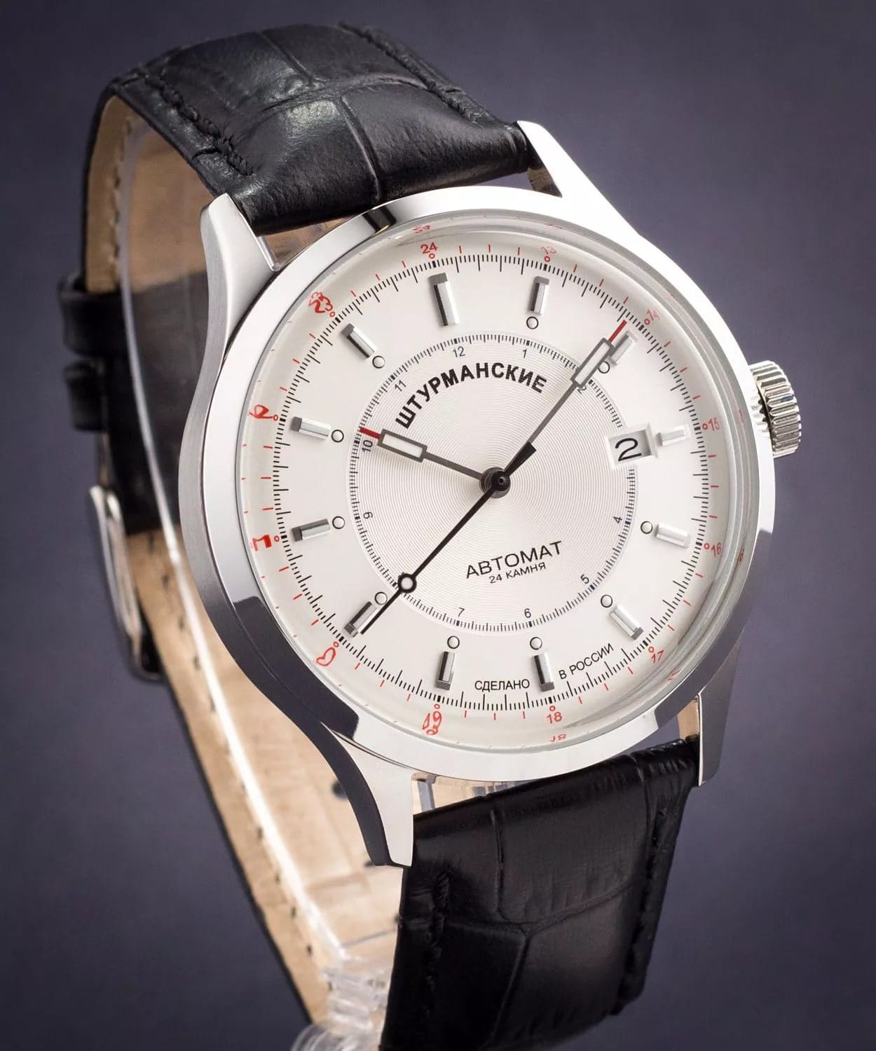 Мужские российские механические часы Штурманские NH35/1811871, механический механизм (автоматический калибр) с высокой точностью. Минеральное стеклоМинеральное стеклоМинеральное стекло представляет собой искусственно выращенный минерал кварца. Такое стекло отличается особой устойчивостью к повреждениям и царапинам. Уступает по некоторым качествам сапфировому стеклу. устойчивое к мелким механическим повреждениям. Класс водозащиты: 50 метров, позволит защитить корпус от случайных брызг или капель дождя. Корпус часов изготовлен из стали. Кожаный ремешок на стандартной застёжке. Чёткая, читаемая минутная шкала уходит за приделы видимой области циферблата, подчёркивая изящность ободка корпуса. Стрелки и метки с люминесцентным покрытиемЛюминесцентное покрытиеПозволяет считывать показания времени в темноте. Производители наносят на стрелки, часовые индексы, безель или поверхность циферблата светонакопительный состав, дающий холодное свечение..