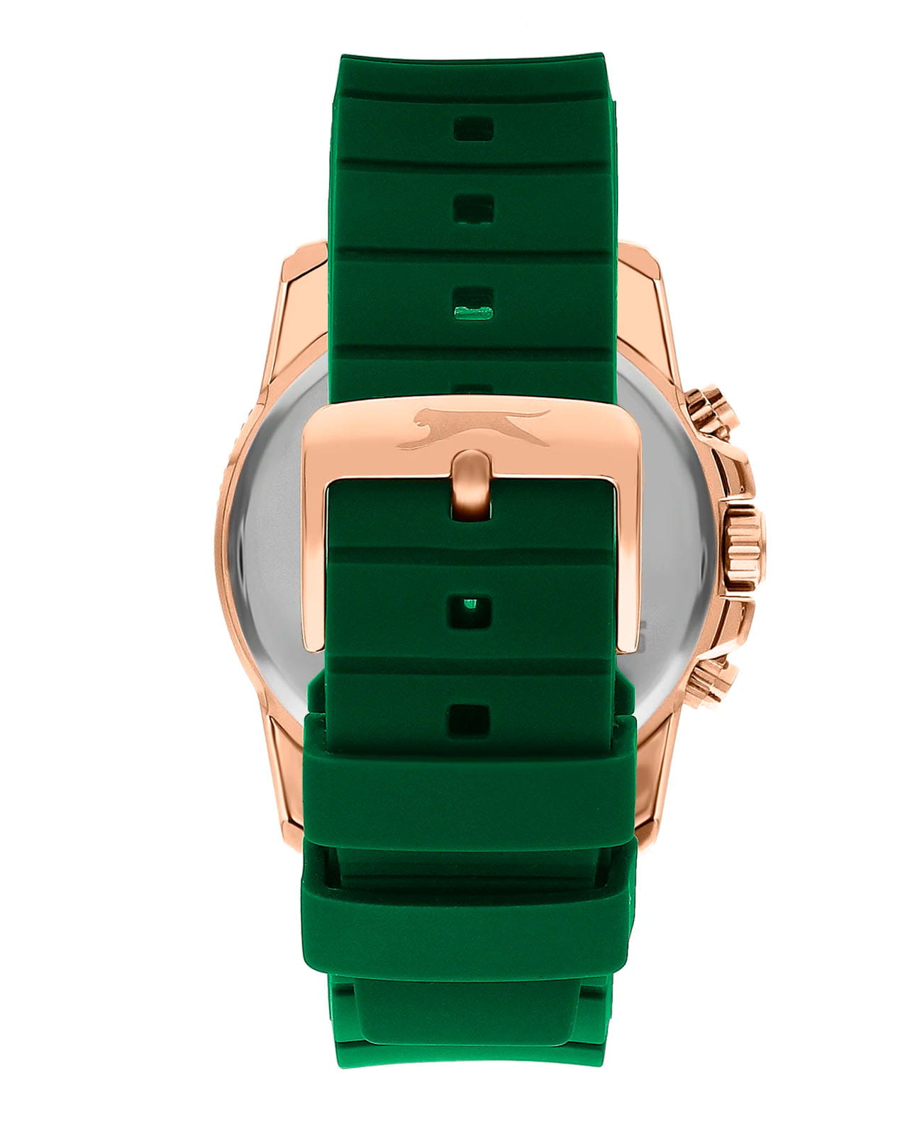 Мужские наручные часы Slazenger SL.09.2012.2.05 сочетают в себе спортивный дизайн и функциональность современных технологий. Модель обладает круглым корпусом диаметром 47 мм, изготовленным из суперметалла с IP-покрытиемIP-покрытиеМетод ионного напыления. Демонстрирует повышенную устойчивость к истиранию, окислению и химическим веществам. Под воздействием высокого давления и температуры около 1500°C молекулы металла надёжно соединяются с частицами корпуса часов., что обеспечивает высокую устойчивость к внешним воздействиям. Браслет выполнен из зеленого полимерного материала, а застежка стандартная, гарантирующая комфортное ношение и безопасность. БезельБезельВнешний ободок, закрепляющий стекло. В спортивных часах так называется поворотное кольцо с делениями на циферблате, выполняет роль таймера – замеряет отрезки времени на шкале. Неподвижный безель – элемент декора. Однонаправленно вращающийся безель на дайверских часах позволяет фиксировать моменты погружения и выныривания на поверхность. с IP-покрытиемIP-покрытиеМетод ионного напыления. Демонстрирует повышенную устойчивость к истиранию, окислению и химическим веществам. Под воздействием высокого давления и температуры около 1500°C молекулы металла надёжно соединяются с частицами корпуса часов.. Зеленый циферблат дополнен индексами и тремя малыми циферблатами для отображения различных функций, а также защищен прочным минеральным стекломМинеральное стеклоМинеральное стекло представляет собой искусственно выращенный минерал кварца. Такое стекло отличается особой устойчивостью к повреждениям и царапинам. Уступает по некоторым качествам сапфировому стеклу. с люминесцентным покрытиемЛюминесцентное покрытиеПозволяет считывать показания времени в темноте. Производители наносят на стрелки, часовые индексы, безель или поверхность циферблата светонакопительный состав, дающий холодное свечение. для лучшей видимости в темноте. Часы работают на кварцевом механизме, что гарантирует точное время без необходимости подзаводки. Водонепроницаемость часов достигает уровня 5 атмосфер (WR50), что позволяет использовать их во время плавания, однако не рекомендуется для глубоководного дайвинга.