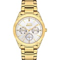 Женские наручные часы Slazenger SL.09.2032.4.03 сочетают в себе элегантность и функциональность для современных женщин. Модель обладает круглым корпусом диаметром 35 мм, изготовленным из суперметалла с IP-покрытиемIP-покрытиеМетод ионного напыления. Демонстрирует повышенную устойчивость к истиранию, окислению и химическим веществам. Под воздействием высокого давления и температуры около 1500°C молекулы металла надёжно соединяются с частицами корпуса часов., что придает изделию роскошный внешний вид и обеспечивает защиту от царапин. Золотистый тон корпуса гармонирует с серебристым циферблатом, украшенным логотипом бренда и выполненном по технологии Sunray (солнечные лучи), создающей игру света и глубины. Часы комплектуются браслетом из суперметалла с IP-покрытиемIP-покрытиеМетод ионного напыления. Демонстрирует повышенную устойчивость к истиранию, окислению и химическим веществам. Под воздействием высокого давления и температуры около 1500°C молекулы металла надёжно соединяются с частицами корпуса часов., который надежно фиксируется благодаря раскладной застежкеРаскладной замокДанный вариант застежки используется только на часах с металлическим браслетом. Отличительная особенность такого крепления в том, что длина браслета становится универсальной и вы можете самостоятельно отрегулировать нужный вам размер – застежка просто двигается по браслету часов.. Для защиты используется минеральное стеклоМинеральное стеклоМинеральное стекло представляет собой искусственно выращенный минерал кварца. Такое стекло отличается особой устойчивостью к повреждениям и царапинам. Уступает по некоторым качествам сапфировому стеклу., обеспечивающее прочную защиту от повреждений. Механизм часов кварцевый, что гарантирует высокую точность хода без необходимости подзаводки. На малых циферблатах отображаются дата, день недели и текущее время в 24-часовом формате, что делает модель не только стильным аксессуаром, но и практичным инструментом для ежедневного использования. Водонепроницаемость часов достигает класса WR30, что позволяет использовать их в условиях легкого контакта с водой, например, во время мытья рук или попадания брызг, однако не рекомендуется для плавания или дайвинга. Стильные женские часы Slazenger SL.09.2032.4.03 станут идеальным дополнением как для повседневного образа, так и для деловых встреч или торжественных мероприятий.