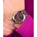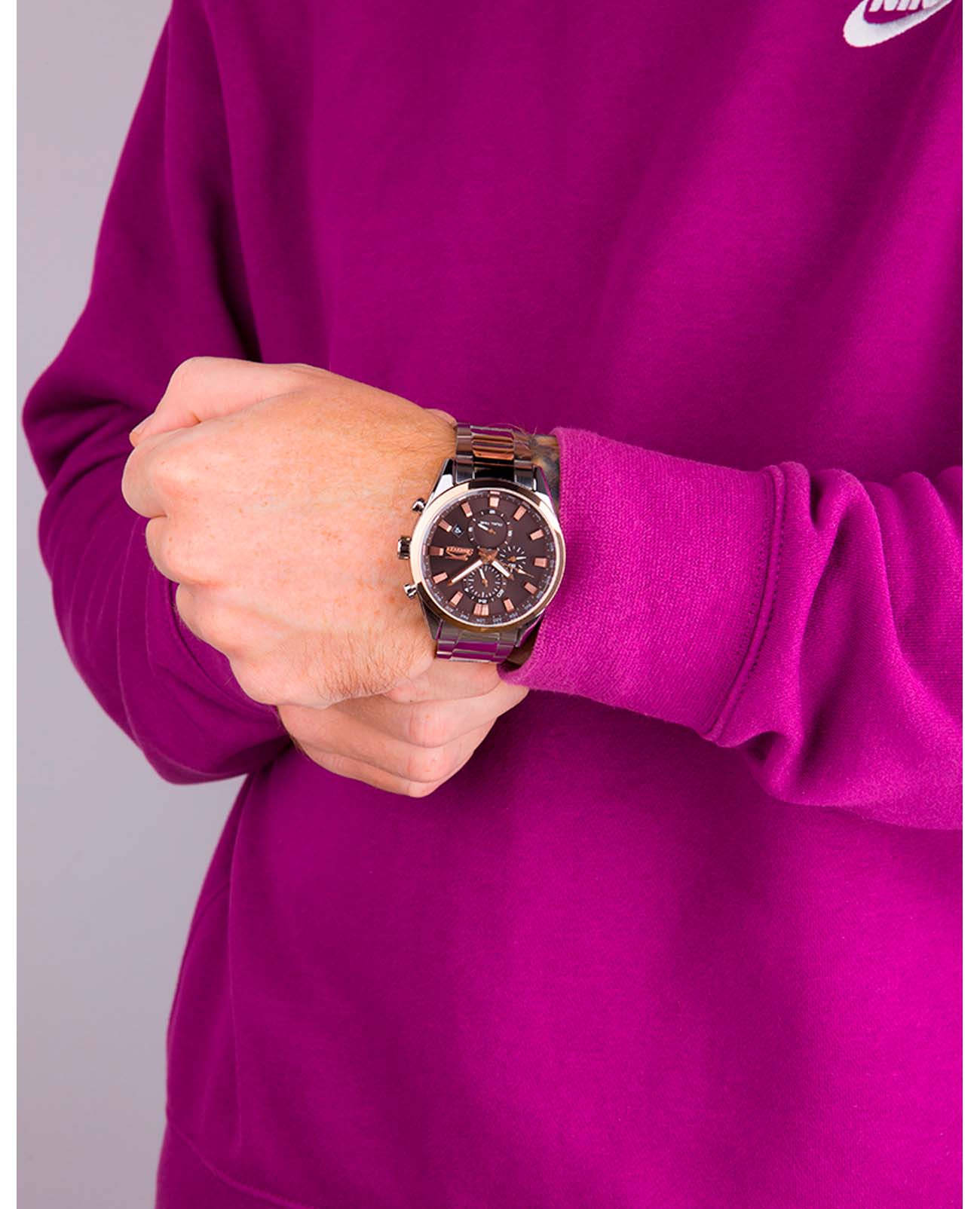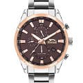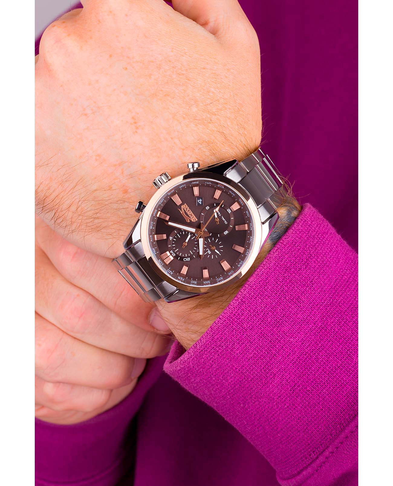 Мужские наручные часы Slazenger SL.09.2058.2.05 сочетают в себе классический дизайн и надежность современных технологий. Модель обладает круглым корпусом диаметром 45 мм. БезельБезельВнешний ободок, закрепляющий стекло. В спортивных часах так называется поворотное кольцо с делениями на циферблате, выполняет роль таймера – замеряет отрезки времени на шкале. Неподвижный безель – элемент декора. Однонаправленно вращающийся безель на дайверских часах позволяет фиксировать моменты погружения и выныривания на поверхность. изготовлен из суперметалла с IP-покрытиемIP-покрытиеМетод ионного напыления. Демонстрирует повышенную устойчивость к истиранию, окислению и химическим веществам. Под воздействием высокого давления и температуры около 1500°C молекулы металла надёжно соединяются с частицами корпуса часов. и обеспечивает высокую устойчивость к внешним воздействиям. Браслет выполнен из металла с раскладной застежкой, гарантирующей комфортное ношение и безопасность. Циферблат декорирован стрелками с люминесцентным покрытиемЛюминесцентное покрытиеПозволяет считывать показания времени в темноте. Производители наносят на стрелки, часовые индексы, безель или поверхность циферблата светонакопительный состав, дающий холодное свечение., которые обеспечивают читаемость времени даже в условиях недостаточной освещенности. Для защиты используется минеральное стеклоМинеральное стеклоМинеральное стекло представляет собой искусственно выращенный минерал кварца. Такое стекло отличается особой устойчивостью к повреждениям и царапинам. Уступает по некоторым качествам сапфировому стеклу., обеспечивающее прочную защиту от царапин. Часы работают на японском кварцевом механизме, что гарантирует точное время без необходимости подзаводки. Модель также оснащена функциями отображения второго часового пояса, дня недели и текущего времени в 24-часовом формате на малых циферблатах, делая её практичной для повседневного использования и путешествий. Водонепроницаемость часов достигает 10 атмосфер, что позволяет использовать их во время плавания и других водных видов спорта, однако не рекомендуется для дайвинга. Толщина корпуса составляет 13 мм, а вес модели — 153 грамма. SL.09.2058.2.05 — это стильный аксессуар, который станет отличным дополнением как формального, так и casual образа мужчины.