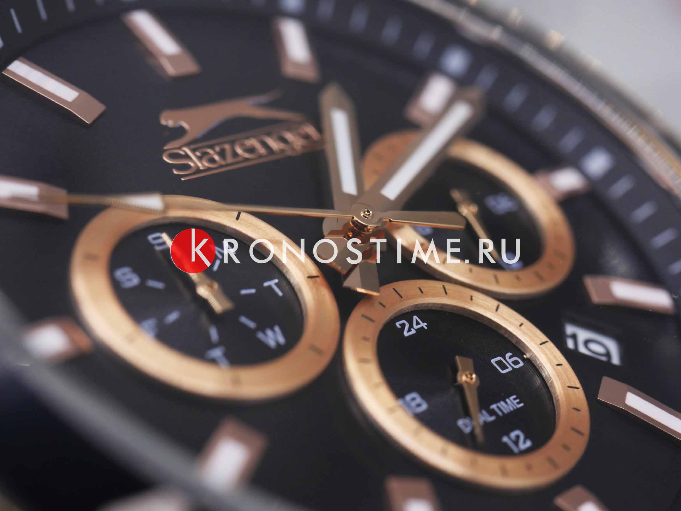 Мужские наручные часы Slazenger SL.09.2091.2.05 сочетают в себе классический дизайн и современные технологии. Модель обладает круглым корпусом диаметром 44 мм из суперметалла, поворотный безельБезельВнешний ободок, закрепляющий стекло. В спортивных часах так называется поворотное кольцо с делениями на циферблате, выполняет роль таймера – замеряет отрезки времени на шкале. Неподвижный безель – элемент декора. Однонаправленно вращающийся безель на дайверских часах позволяет фиксировать моменты погружения и выныривания на поверхность. с IP-покрытиемIP-покрытиеМетод ионного напыления. Демонстрирует повышенную устойчивость к истиранию, окислению и химическим веществам. Под воздействием высокого давления и температуры около 1500°C молекулы металла надёжно соединяются с частицами корпуса часов., что обеспечивает устойчивость к царапинам и коррозии. Браслет изготовлен из нержавеющей стали с частичным IP-покрытиемIP-покрытиеМетод ионного напыления. Демонстрирует повышенную устойчивость к истиранию, окислению и химическим веществам. Под воздействием высокого давления и температуры около 1500°C молекулы металла надёжно соединяются с частицами корпуса часов. на раскладной застежкеРаскладной замокДанный вариант застежки используется только на часах с металлическим браслетом. Отличительная особенность такого крепления в том, что длина браслета становится универсальной и вы можете самостоятельно отрегулировать нужный вам размер – застежка просто двигается по браслету часов., гарантирующей удобство и надежность при ношении. Циферблат черного цвета украшен стрелками с люминесцентным покрытиемЛюминесцентное покрытиеПозволяет считывать показания времени в темноте. Производители наносят на стрелки, часовые индексы, безель или поверхность циферблата светонакопительный состав, дающий холодное свечение., что обеспечивает читаемость времени даже в условиях слабого освещения. Для защиты циферблата используется минеральное стеклоМинеральное стеклоМинеральное стекло представляет собой искусственно выращенный минерал кварца. Такое стекло отличается особой устойчивостью к повреждениям и царапинам. Уступает по некоторым качествам сапфировому стеклу., устойчивое к царапинам и повреждениям. Часы оснащены кварцевым механизмом Miyota, обеспечивающим точность хода с погрешностью не более ±15 секунд в месяц. Модель также включает функции отображения даты, дня недели и второго часового поясаВторой часовой поясФункция, позволяющая отображать время двух часовых поясов одновременно., что делает ее практичной для повседневного использования. Водонепроницаемость часов составляет 5 атмосфер (50 метров), что позволяет использовать их при плавании, но не рекомендуется для дайвинга. Вес модели — 143 грамма, а производитель предоставляет гарантию сроком 12 месяцев. SL.09.2091.2.05 — это стильный аксессуар, который подчеркнет стиль и практичность в любом образе мужчины.