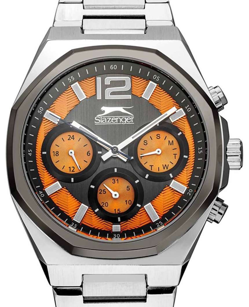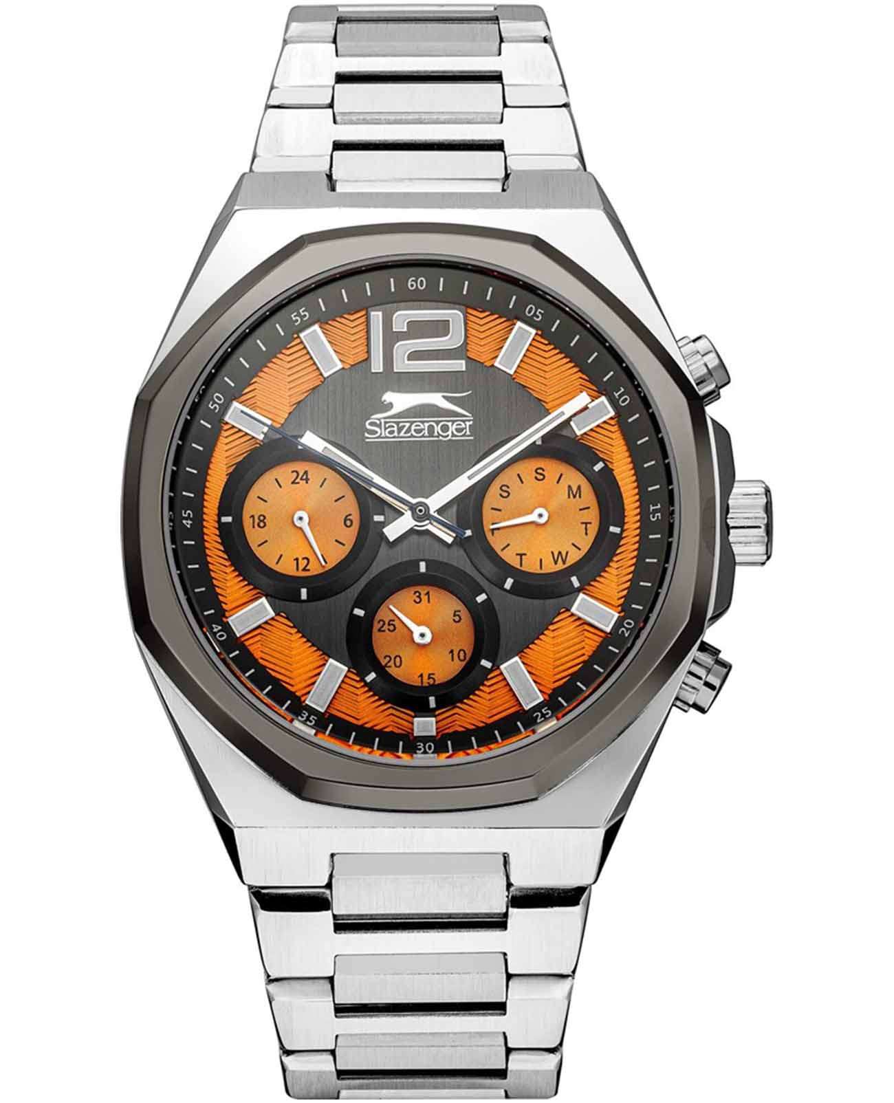 Часы Slazenger SL.09.2106.2.08 представляют собой идеальное сочетание элегантности и функциональности для стильных мужчин. Их оранжево-черный циферблат, защищенный прочным минеральным стекломМинеральное стеклоМинеральное стекло представляет собой искусственно выращенный минерал кварца. Такое стекло отличается особой устойчивостью к повреждениям и царапинам. Уступает по некоторым качествам сапфировому стеклу., обрамлен корпусом из суперметалла диаметром 41 мм, а безельБезельВнешний ободок, закрепляющий стекло. В спортивных часах так называется поворотное кольцо с делениями на циферблате, выполняет роль таймера – замеряет отрезки времени на шкале. Неподвижный безель – элемент декора. Однонаправленно вращающийся безель на дайверских часах позволяет фиксировать моменты погружения и выныривания на поверхность. этих часов из суперметалла с черным IP-покрытиемIP-покрытиеМетод ионного напыления. Демонстрирует повышенную устойчивость к истиранию, окислению и химическим веществам. Под воздействием высокого давления и температуры около 1500°C молекулы металла надёжно соединяются с частицами корпуса часов.. Кварцевый механизм гарантирует точность, а водозащита 5 ATM позволяет не волноваться о случайных брызгах. Стальной браслет из суперметалла с раскладной застёжкойРаскладная застёжкаТакой тип застёжки используется только на браслетах из металла. Она никогда не раскрывается полностью, происходит разделение на 2 и более частей. Раскладывающая застёжка снизит вероятность потери часов к минимуму., придает часовому изделию современный и изысканный вид. Функции 24-часового указателя времени, а также отображение даты и дня недели обеспечивают дополнительное удобство в повседневной жизни. Люминесцентное покрытиеЛюминесцентное покрытиеПозволяет считывать показания времени в темноте. Производители наносят на стрелки, часовые индексы, безель или поверхность циферблата светонакопительный состав, дающий холодное свечение. на стрелках и метках обеспечивает удобство считывания времени в темное время суток.