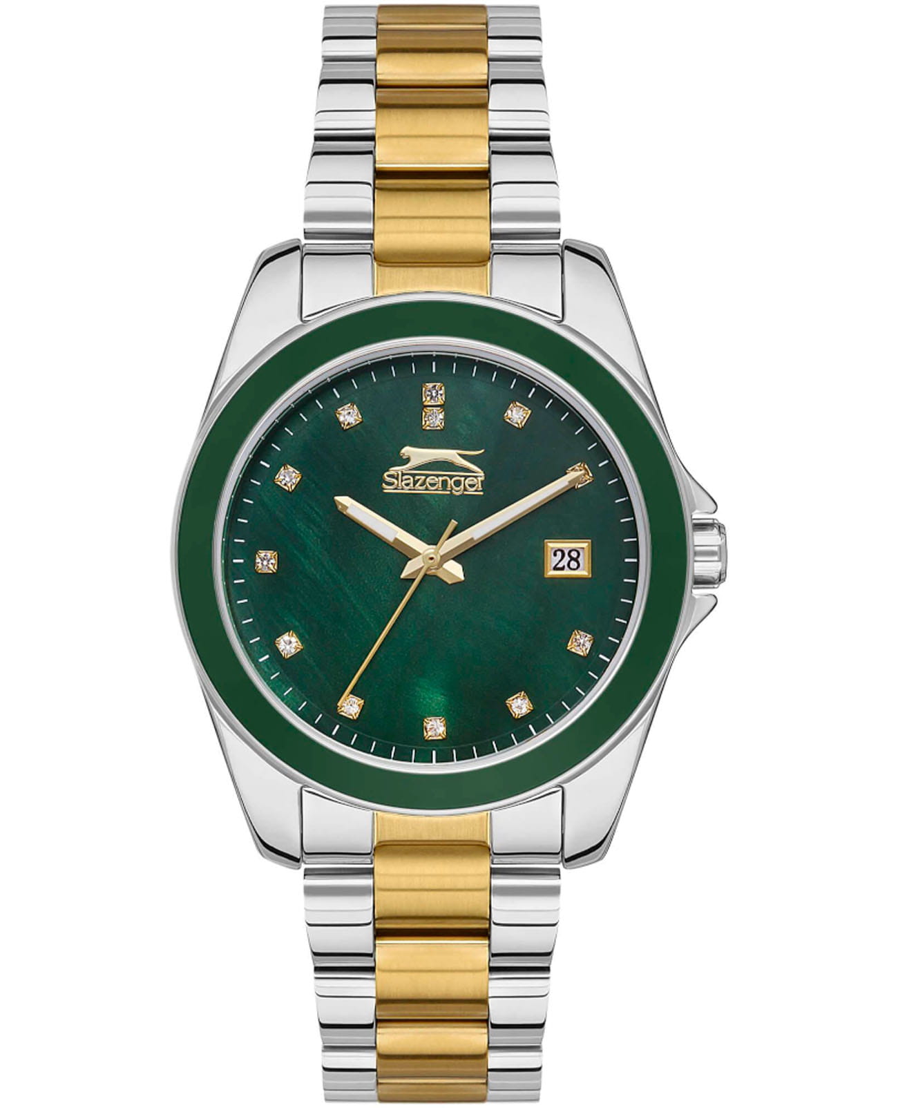 Женские наручные часы Slazenger SL.09.2142.3.03 сочетают в себе элегантный дизайн и надежность современных технологий. Модель обладает корпусом размерами 37 мм, изготовленным из суперметалла, что обеспечивает высокую устойчивость к внешним воздействиям. БезельБезельВнешний ободок, закрепляющий стекло. В спортивных часах так называется поворотное кольцо с делениями на циферблате, выполняет роль таймера – замеряет отрезки времени на шкале. Неподвижный безель – элемент декора. Однонаправленно вращающийся безель на дайверских часах позволяет фиксировать моменты погружения и выныривания на поверхность. с IP-покрытиемIP-покрытиеМетод ионного напыления. Демонстрирует повышенную устойчивость к истиранию, окислению и химическим веществам. Под воздействием высокого давления и температуры около 1500°C молекулы металла надёжно соединяются с частицами корпуса часов.. Браслет из суперметалла с частичным IP-покрытиемIP-покрытиеМетод ионного напыления. Демонстрирует повышенную устойчивость к истиранию, окислению и химическим веществам. Под воздействием высокого давления и температуры около 1500°C молекулы металла надёжно соединяются с частицами корпуса часов. гарантирует комфортное ношение и стильный внешний вид. Циферблат зеленого цвета декорирован кристаллами в виде меток. Для защиты используется минеральное стеклоМинеральное стеклоМинеральное стекло представляет собой искусственно выращенный минерал кварца. Такое стекло отличается особой устойчивостью к повреждениям и царапинам. Уступает по некоторым качествам сапфировому стеклу., обеспечивающее прочную защиту от царапин. Часы работают на кварцевом механизме, поэтому гарантирует точное время без необходимости подзаводки. Модель также оснащена функцией отображения даты, делая ее практичной для повседневного использования. Водонепроницаемость часов достигает 3 атмосфер, что позволяет использовать их при мытье рук или хождении под мелким дождем, однако не рекомендуется для плавания или других водных видов спорта. Вес модели составляет 97 грамм.