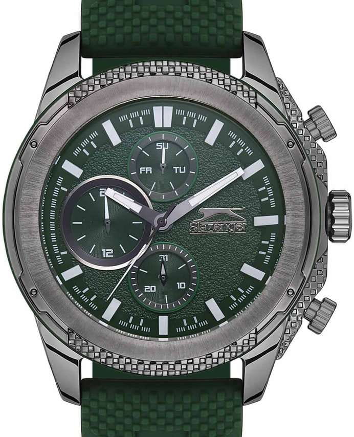 Часы Slazenger SL.09.2153.2.04 представляют собой стильный и функциональный аксессуар для мужчин. Эти кварцевые часы идеально подходят для тех, кто ценит как точность, так и современный дизайн. Корпус и безельБезельВнешний ободок, закрепляющий стекло. В спортивных часах так называется поворотное кольцо с делениями на циферблате, выполняет роль таймера – замеряет отрезки времени на шкале. Неподвижный безель – элемент декора. Однонаправленно вращающийся безель на дайверских часах позволяет фиксировать моменты погружения и выныривания на поверхность. из суперметалла с серым IP-покрытиемIP-покрытиеМетод ионного напыления. Демонстрирует повышенную устойчивость к истиранию, окислению и химическим веществам. Под воздействием высокого давления и температуры около 1500°C молекулы металла надёжно соединяются с частицами корпуса часов. придаёт модели прочность и долговечность, а зеленый силиконовый ремешок обеспечивает комфортное ношение и отлично сочетается с общим дизайном часов. Диаметр корпуса составляет 46 мм, а толщина — 12 мм, что делает часы выразительными и заметными на запястье. Минеральное стеклоМинеральное стеклоМинеральное стекло представляет собой искусственно выращенный минерал кварца. Такое стекло отличается особой устойчивостью к повреждениям и царапинам. Уступает по некоторым качествам сапфировому стеклу. защищает циферблат от царапин и повреждений, сохраняя его внешний вид. Часы обладают водозащитой уровня WR 50, что позволяет им выдерживать воздействие воды в повседневных ситуациях. Одной из ключевых особенностей является наличие дополнительных малых циферблатов, которые отображают дату, день недели и текущее время в 24-часовом формате. Все эти функции обеспечивают удобное пользование и позволяют всегда оставаться в курсе времени. Люминесцентное покрытиеЛюминесцентное покрытиеПозволяет считывать показания времени в темноте. Производители наносят на стрелки, часовые индексы, безель или поверхность циферблата светонакопительный состав, дающий холодное свечение. на стрелках обеспечивает отличную видимость в темноте. Силиконовый ремешок оснащен классической застежкой, что обеспечивает надежную фиксацию на руке. Вес часов составляет 104 грамма, что делает их достаточно легкими для повседневного использования.