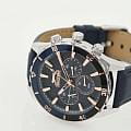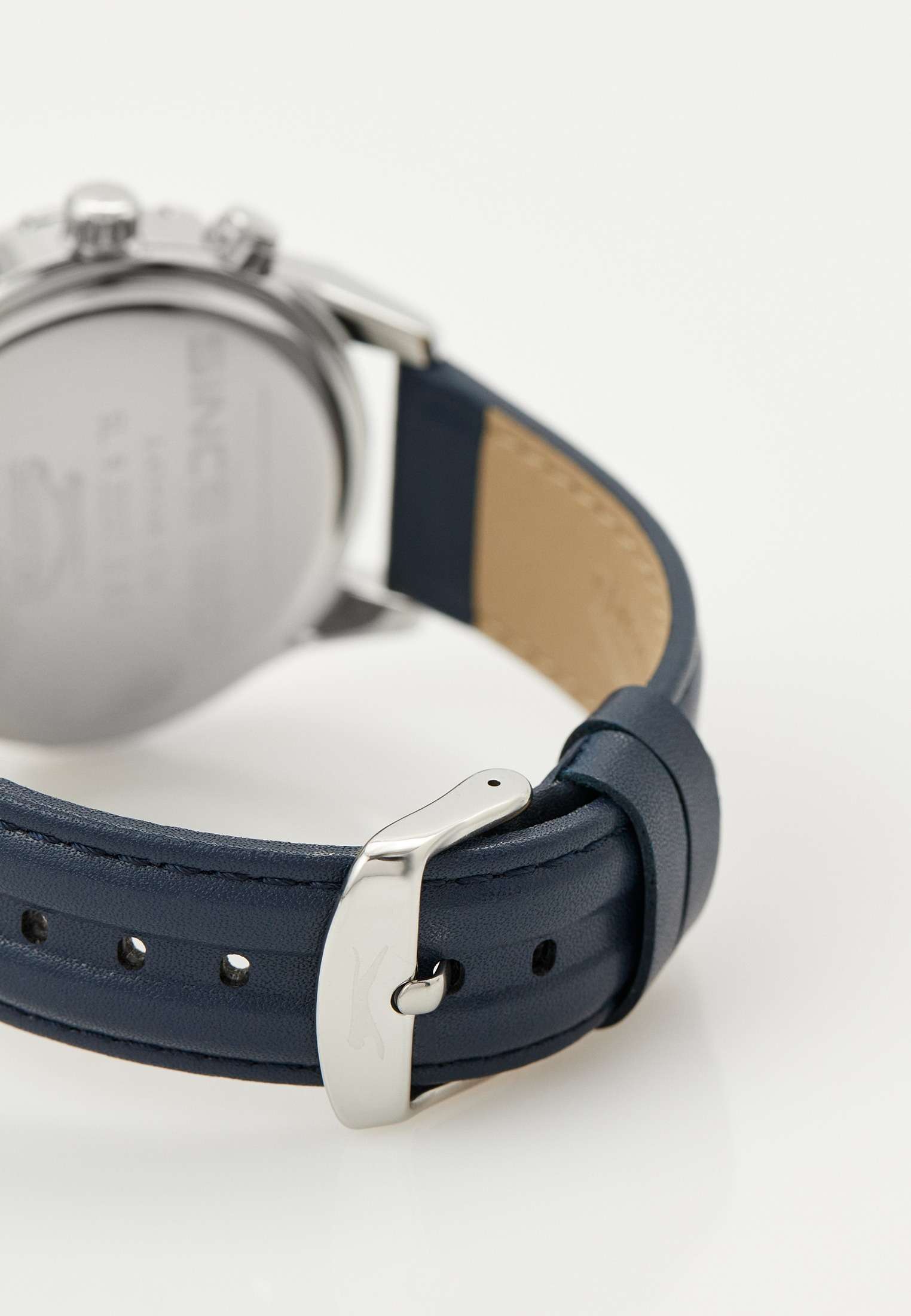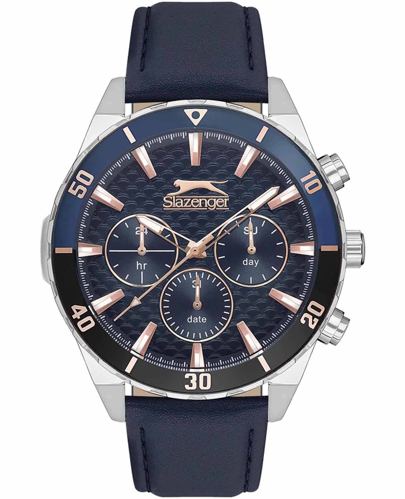 Часы Slazenger SL.09.2237.2.02 — это стильная и надежная модель, которая станет отличным выбором для активного современного мужчины. Крупный корпус диаметром 46 мм выполнен из прочного металла, а синий кожаный ремешок с классической застежкой, что обеспечивает комфорт при повседневном ношении. На безельБезельВнешний ободок, закрепляющий стекло. В спортивных часах так называется поворотное кольцо с делениями на циферблате, выполняет роль таймера – замеряет отрезки времени на шкале. Неподвижный безель – элемент декора. Однонаправленно вращающийся безель на дайверских часах позволяет фиксировать моменты погружения и выныривания на поверхность. нанесено черное и синее IP-покрытиеIP-покрытиеМетод ионного напыления. Демонстрирует повышенную устойчивость к истиранию, окислению и химическим веществам. Под воздействием высокого давления и температуры около 1500°C молекулы металла надёжно соединяются с частицами корпуса часов.. Минеральное стеклоМинеральное стеклоМинеральное стекло представляет собой искусственно выращенный минерал кварца. Такое стекло отличается особой устойчивостью к повреждениям и царапинам. Уступает по некоторым качествам сапфировому стеклу. защищает текстурированный синий циферблат от случайных царапин, а водозащита уровня WR 50 позволяет не переживать о попадании влаги при контакте с водой. На циферблате расположены дополнительные малые циферблаты с отображением даты, дня недели и времени в 24-часовом формате, что делает использование часов максимально функциональным. Для удобства использования в темное время суток предусмотрено люминесцентное покрытиеЛюминесцентное покрытиеПозволяет считывать показания времени в темноте. Производители наносят на стрелки, часовые индексы, безель или поверхность циферблата светонакопительный состав, дающий холодное свечение. стрелок. Толщина корпуса составляет 12 мм, вес часов — 76 грамма.