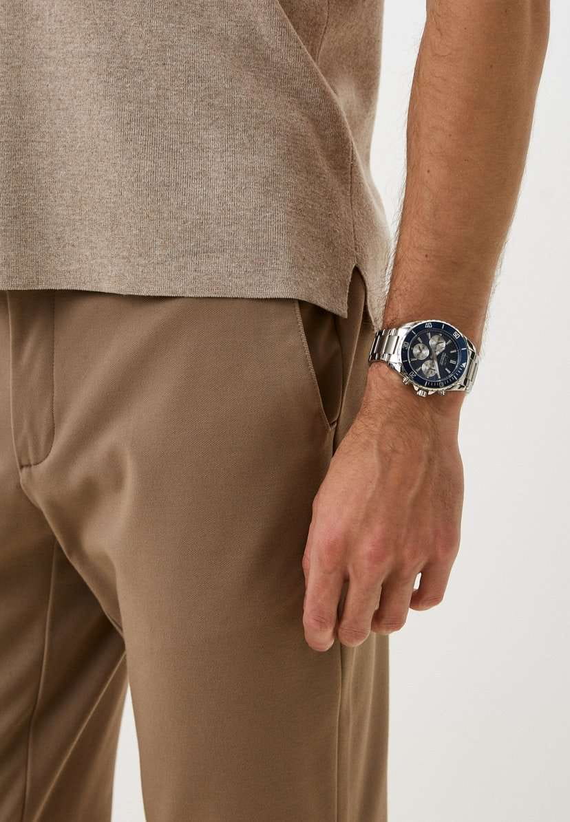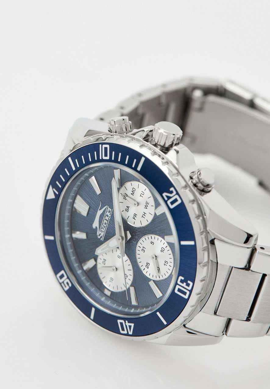 Часы Slazenger SL.09.2273.2.02 – стильный и функциональный аксессуар, который станет достойным дополнением к вашему образу. Модель оснащена надежным кварцевым механизмом, заключенным в корпус из инновационного суперметалла – прочного сплава на основе меди с пониженным содержанием цинка и никеля и специальным покрытием, устойчивым к износу. На безельБезельВнешний ободок, закрепляющий стекло. В спортивных часах так называется поворотное кольцо с делениями на циферблате, выполняет роль таймера – замеряет отрезки времени на шкале. Неподвижный безель – элемент декора. Однонаправленно вращающийся безель на дайверских часах позволяет фиксировать моменты погружения и выныривания на поверхность. нанесено синее IP-покрытиеIP-покрытиеМетод ионного напыления. Демонстрирует повышенную устойчивость к истиранию, окислению и химическим веществам. Под воздействием высокого давления и температуры около 1500°C молекулы металла надёжно соединяются с частицами корпуса часов., что придает аксессуару утончённый и универсальный внешний вид. Синий циферблат под минеральным стекломМинеральное стеклоМинеральное стекло представляет собой искусственно выращенный минерал кварца. Такое стекло отличается особой устойчивостью к повреждениям и царапинам. Уступает по некоторым качествам сапфировому стеклу. дополнен отдельными счетчиками: 24-часовой указатель времени, индикаторы даты и дня недели. Диаметр корпуса составляет 44 мм, а толщина – 12 мм, что обеспечивает комфортную посадку на запястье и подчёркивает современный стиль часов.Браслет из суперметалла и с раскладной застёжкойРаскладная застёжкаТакой тип застёжки используется только на браслетах из металла. Она никогда не раскрывается полностью, происходит разделение на 2 и более частей. Раскладывающая застёжка снизит вероятность потери часов к минимуму. обеспечивает комфортную посадку. Стрелки и метки с люминесцентным покрытиемЛюминесцентное покрытиеПозволяет считывать показания времени в темноте. Производители наносят на стрелки, часовые индексы, безель или поверхность циферблата светонакопительный состав, дающий холодное свечение. удобно подсвечиваются в темноте после зарядки на свету. Водонепроницаемость 5 АТМ защищает механизм от брызг и дождя, позволяя не беспокоиться о сохранности аксессуара в повседневной жизни. Эта модель станет отличным выбором для ежедневного ношения или особых случаев и прекрасным подарком для мужчины к любому празднику.