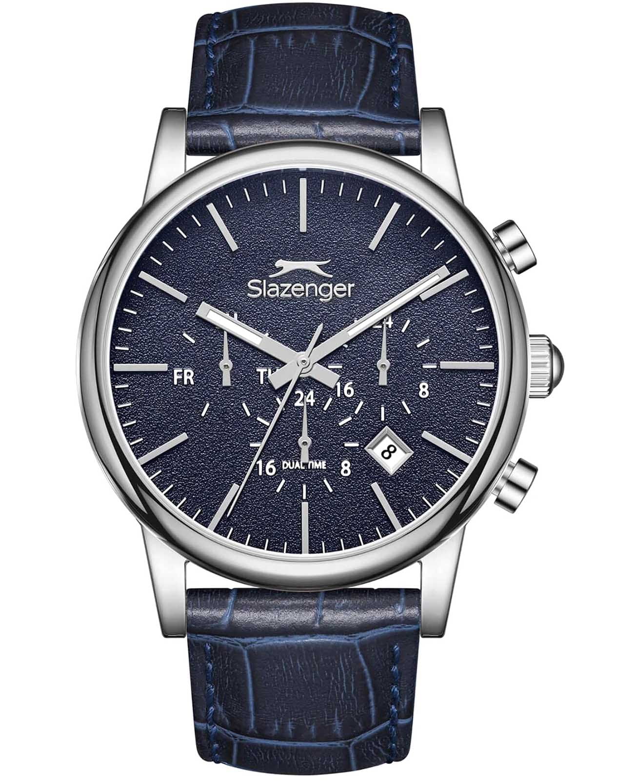 Мужские кварцевые часы Slazenger — это выразительный и функциональный аксессуар. Корпус диаметром 43 мм и толщиной 12 мм выполнен из нержавеющей стали 316L. Циферблат синего цвета оформлен индексами и стрелками. Циферблат защищён минеральным стекломМинеральное стеклоМинеральное стекло представляет собой искусственно выращенный минерал кварца. Такое стекло отличается особой устойчивостью к повреждениям и царапинам. Уступает по некоторым качествам сапфировому стеклу.. Стрелки с люминесцентным покрытиемЛюминесцентное покрытиеПозволяет считывать показания времени в темноте. Производители наносят на стрелки, часовые индексы, безель или поверхность циферблата светонакопительный состав, дающий холодное свечение., обеспечивающим хорошую читаемость в темноте. Механизм — кварцевый. Часы оснащены индикацией дня недели, даты, 12/24-часового формата времени и функцией второго часового пояса (GMT)Второй часовой поясФункция, позволяющая отображать время двух часовых поясов одновременно.. Окошко даты расположено между 4 и 5 часами. Часы оснащены кожаным ремешком с стандартной застёжкой. Водонепроницаемость 100 м позволяет использовать часы для плавания и повседневного ношения. Гарантия — 12 месяцев. Идеальный выбор для тех, кто ценит стиль, функциональность и качество.