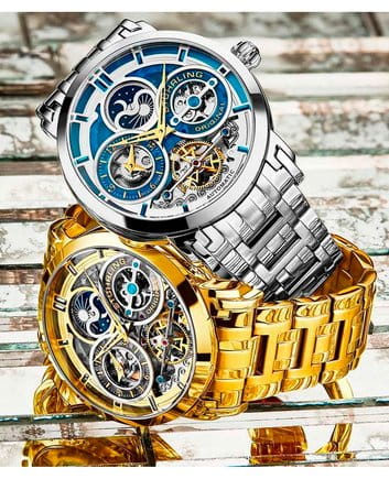 Мужские наручные часы Stührling Original 371B.03 из коллекции Luciano Automatic Skeleton сочетают в себе классический дизайн и современные технологии . Модель оснащена механическим механизмом с автоподзаводом, что гарантирует точность хода без необходимости ручного завода . Корпус часов диаметром 47 мм изготовлен из нержавеющей стали с PVD-покрытиемPVDУльтратонкое покрытие наносится в технике вакуумного напыления, сочетает в себе нитрид титана особой прочности со слоем золота или оксида хрома. Несёт в себе декоративную или защитную функцию. под золото, что подчеркивает элегантность модели . Защиту циферблата обеспечивает прочное стекло KrysternaKrysternaKrysterna — инновационное стекло для наручных часов. Благодаря уникальной структуре, Krysterna объединяет ключевые преимущества двух материалов: твердость сапфира, защищающую от царапин, и гибкость минерального стекла, обеспечивающую устойчивость к деформациям. Такая комбинация делает его идеальным решением для часов, подверженных экстремальным нагрузкам, сохраняя при этом оптическую прозрачность., известное своей устойчивостью к царапинам и механическим повреждениям . Циферблат выполнен в стиле , что позволяет наблюдать за работой внутреннего механизма и демонстрирует сложность инженерного решения . Такой дизайн делает модель не только функциональной, но и стильной, привлекая внимание ценителей сложных технических решений. Браслет из того же материала на раскладной застёжкеРаскладная застёжкаТакой тип застёжки используется только на браслетах из металла. Она никогда не раскрывается полностью, происходит разделение на 2 и более частей. Раскладывающая застёжка снизит вероятность потери часов к минимуму.. Водонепроницаемость модели достигает 5 атмосфер (50 метров), что позволяет использовать их в повседневных условиях, включая контакт с водой, например, при мытье рук или дожде . Заводная головка с системой завинчивания обеспечивает дополнительную защиту механизма от внешних воздействий.