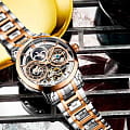 Мужские наручные часы Stührling Original 371B.05 из коллекции Luciano Automatic Skeleton сочетают в себе классический дизайн и современные технологии . Модель оснащена механическим механизмом с автоподзаводом, что гарантирует точность хода без необходимости ручного завода . Корпус часов диаметром 46 мм изготовлен из нержавеющей стали, что подчеркивает элегантность модели . БезельБезельВнешний ободок, закрепляющий стекло. В спортивных часах так называется поворотное кольцо с делениями на циферблате, выполняет роль таймера – замеряет отрезки времени на шкале. Неподвижный безель – элемент декора. Однонаправленно вращающийся безель на дайверских часах позволяет фиксировать моменты погружения и выныривания на поверхность. с PVD-покрытиемPVDУльтратонкое покрытие наносится в технике вакуумного напыления, сочетает в себе нитрид титана особой прочности со слоем золота или оксида хрома. Несёт в себе декоративную или защитную функцию.. Защиту циферблата обеспечивает прочное стекло KrysternaKrysternaKrysterna — инновационное стекло для наручных часов. Благодаря уникальной структуре, Krysterna объединяет ключевые преимущества двух материалов: твердость сапфира, защищающую от царапин, и гибкость минерального стекла, обеспечивающую устойчивость к деформациям. Такая комбинация делает его идеальным решением для часов, подверженных экстремальным нагрузкам, сохраняя при этом оптическую прозрачность., известное своей устойчивостью к царапинам и механическим повреждениям . Циферблат выполнен в стиле , что позволяет наблюдать за работой внутреннего механизма и демонстрирует сложность инженерного решения . Такой дизайн делает модель не только функциональной, но и стильной, привлекая внимание ценителей сложных технических решений. Часы оснащены функцией второго часового поясаВторой часовой поясФункция, позволяющая отображать время двух часовых поясов одновременно. и анимированным индикатором AM/PM в виде солнца и луны, что делает их удобными для путешественников . Водонепроницаемость модели достигает 5 атмосфер (50 метров), что позволяет использовать их в повседневных условиях, включая контакт с водой, например, при мытье рук или дожде . Заводная головка с системой завинчивания обеспечивает дополнительную защиту механизма от внешних воздействий.