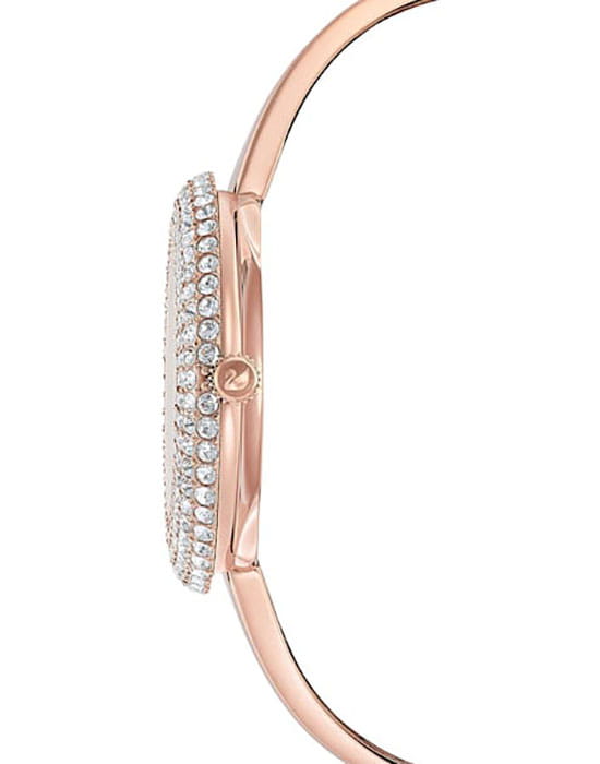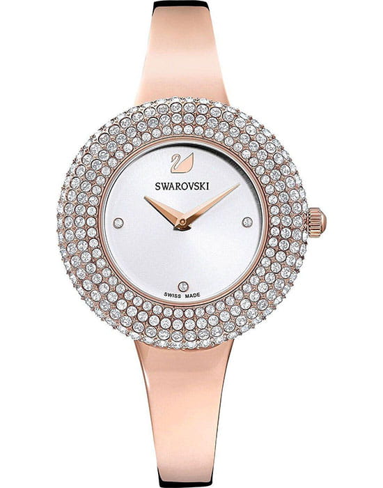 Женские часы Swarovski Crystal Rose 5484073 – это элегантные и утончённые часы, отличающиеся непревзойдённым сиянием. БезельБезельВнешний ободок, закрепляющий стекло. В спортивных часах так называется поворотное кольцо с делениями на циферблате, выполняет роль таймера – замеряет отрезки времени на шкале. Неподвижный безель – элемент декора. Однонаправленно вращающийся безель на дайверских часах позволяет фиксировать моменты погружения и выныривания на поверхность. украшен микропаве из 215 кристаллов. Завершающие штрихи уникального дизайна – корпус и браслет из нержавеющей стали с PVDPVDУльтратонкое покрытие наносится в технике вакуумного напыления, сочетает в себе нитрид титана особой прочности со слоем золота или оксида хрома. Несёт в себе декоративную или защитную функцию. покрытием оттенка розового золота и белый циферблат с рисунком в виде солнечных лучей и тремя метками из прозрачных кристаллов. Надежное минеральное стеклоМинеральное стеклоМинеральное стекло представляет собой искусственно выращенный минерал кварца. Такое стекло отличается особой устойчивостью к повреждениям и царапинам. Уступает по некоторым качествам сапфировому стеклу. защищает часы от царапин и долго сохраняет первоначальный внешний вид. Водозащита 50 метров делает часы практичными для повседневного использования.