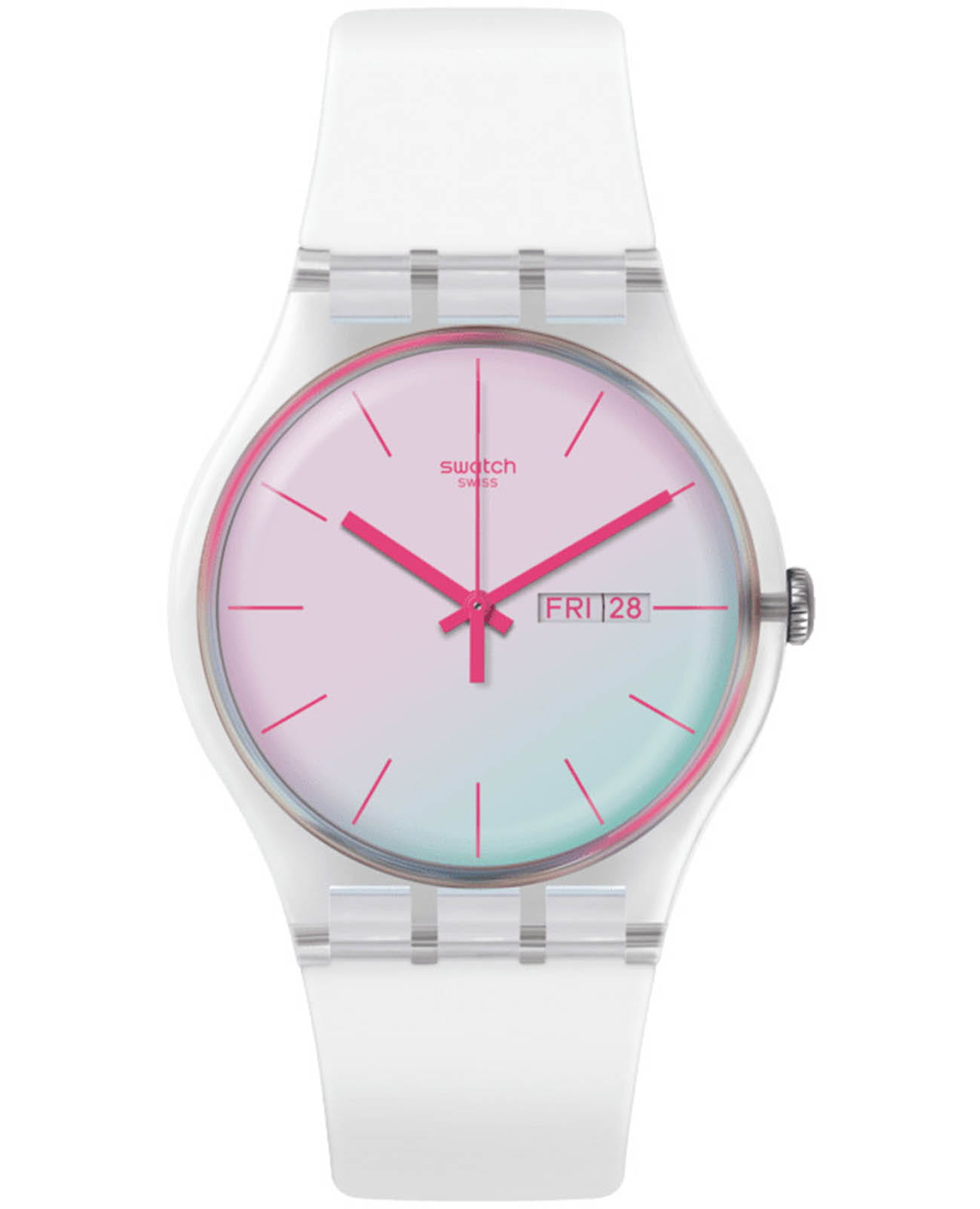 Часы Swatch SUOK713 — это стильный и современный аксессуар для тех, кто ценит лёгкость и комфорт. Часы идеально подойдут как для мужчин, так и для женщин. Розовый, зеленый и голубой циферблат этих часов, украшенный стеклом Swatch Solar Spectrum Glass, привлекает внимание. Белый ремешок и прозрачный корпус являются отличными дополнительными элементами. На циферблате присутствует окошко календаря в районе отметки 3 часа.  Водозащита 30 метров делает часы практичными для повседневного использования. Эти часы подойдут для повседневного ношения и станут ярким акцентом в вашем наряде.