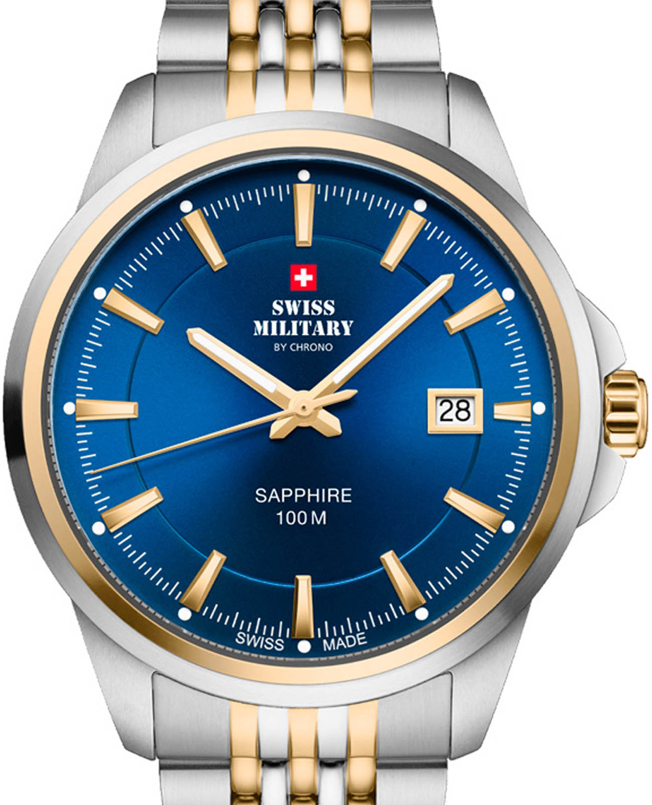 Часы Swiss Military SM34104.05 — это элегантный мужской аксессуар, сочетающий швейцарское качество и классический дизайн. Корпус диаметром 40 мм и браслет выполнены из нержавеющей стали и БезельБезельВнешний ободок, закрепляющий стекло. В спортивных часах так называется поворотное кольцо с делениями на циферблате, выполняет роль таймера – замеряет отрезки времени на шкале. Неподвижный безель – элемент декора. Однонаправленно вращающийся безель на дайверских часах позволяет фиксировать моменты погружения и выныривания на поверхность. с PVD-покрытиемPVDУльтратонкое покрытие наносится в технике вакуумного напыления, сочетает в себе нитрид титана особой прочности со слоем золота или оксида хрома. Несёт в себе декоративную или защитную функцию., придающим изделию изысканный двухцветный вид. Синий циферблат с солнечным узором украшен золотистыми часовыми метками и стрелками, защищёнными прочным сапфировым стекломСапфировое стеклоПрочный и надёжный материал из кристалла сапфира синтетического происхождения, характеризующийся особой твёрдостью и устойчивостью к царапинам и повреждениям., устойчивым к царапинам.