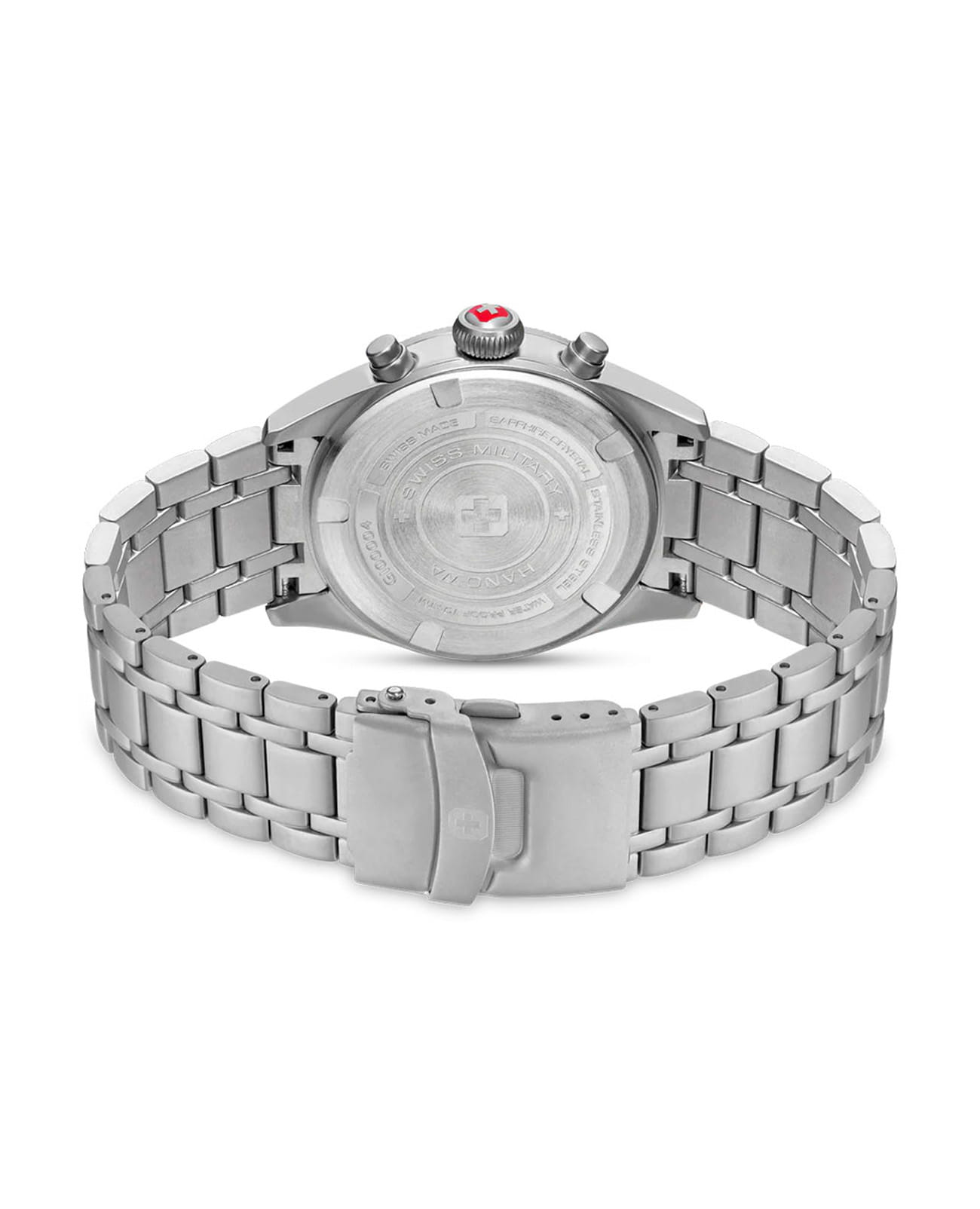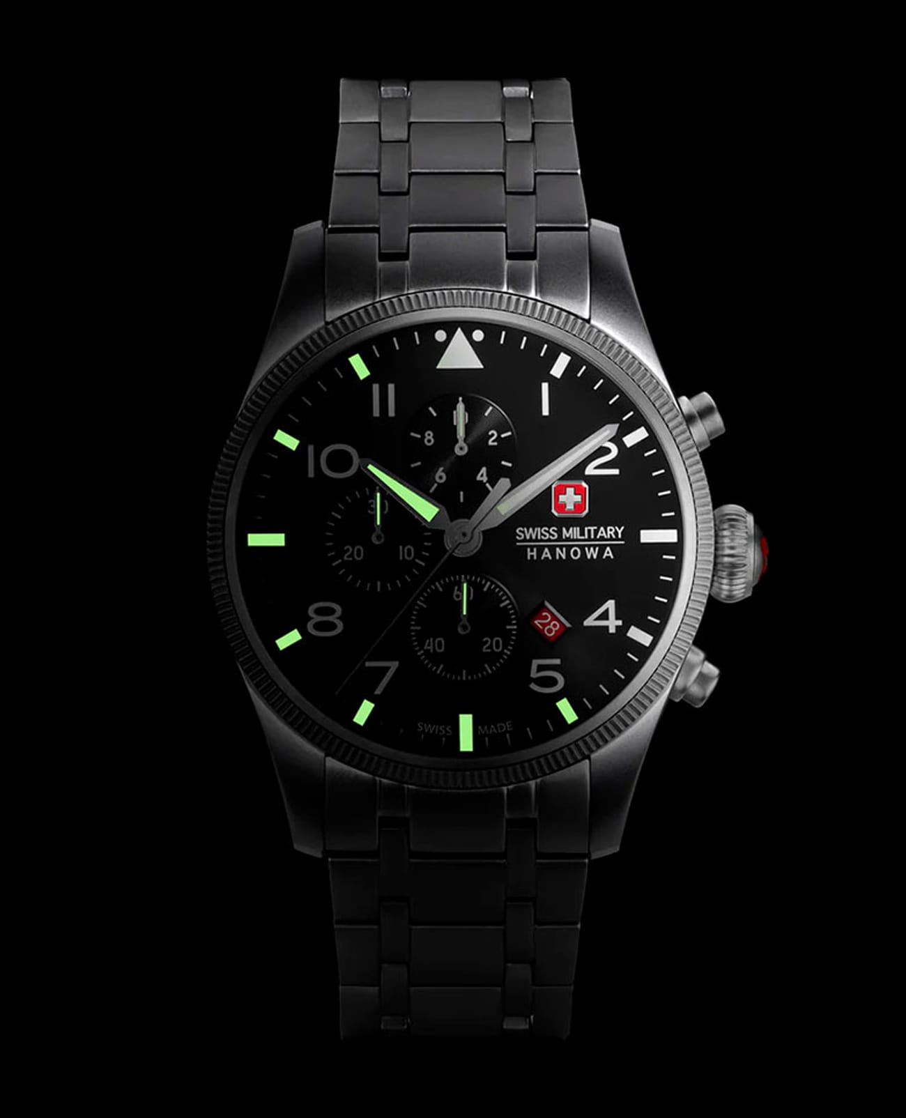 Мужские швейцарские часы-хронографХронографФункция позволяет измерять отрезки времени с особой точностью: часы, минуты, секунды. Верным признаком хронографа является наличие на циферблате 3 дополнительных окошек-счётчиков. Swiss Military Hanowa Thunderbolt Chrono SMWGI0000405, кварцевый механизм с высокой точностью. Сапфировое стеклоСапфировое стеклоПрочный и надёжный материал из кристалла сапфира синтетического происхождения, характеризующийся особой твёрдостью и устойчивостью к царапинам и повреждениям. устойчивое к появлению царапин, обладающее высокой прозрачностью. Секундная стрелка вынесена на малый циферблат. Стрелки с люминесцентным покрытиемЛюминесцентное покрытиеПозволяет считывать показания времени в темноте. Производители наносят на стрелки, часовые индексы, безель или поверхность циферблата светонакопительный состав, дающий холодное свечение.. Окошко даты находится в положении между 4 и 5 часов. Класс водозащиты: 100 метров, позволит плавать, нырять и заниматься другими водными видами спорта. Стальной браслет на раскладной застёжкеРаскладная застёжкаТакой тип застёжки используется только на браслетах из металла. Она никогда не раскрывается полностью, происходит разделение на 2 и более частей. Раскладывающая застёжка снизит вероятность потери часов к минимуму..