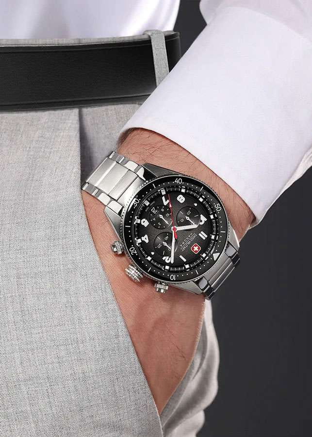 Swiss Military Hanowa Greyhound SMWGI0003803 — мужские часы-хронографХронографФункция позволяет измерять отрезки времени с особой точностью: часы, минуты, секунды. Верным признаком хронографа является наличие на циферблате 3 дополнительных окошек-счётчиков., воплощение швейцарского качества и элегантного дизайна. Эти часы идеально подойдут для уверенного в себе мужчины, ценящего стиль и надежность. Корпус часов выполнен из нержавеющей стали, что придает им современный и мужественный вид. Диаметр корпуса составляет 43 мм, что делает их универсальным аксессуаром для любого случая. Черный циферблат с серыми арабскими цифрами и стрелками светящимися в темноте благодаря люминесцентному покрытиюЛюминесцентное покрытиеПозволяет считывать показания времени в темноте. Производители наносят на стрелки, часовые индексы, безель или поверхность циферблата светонакопительный состав, дающий холодное свечение. обеспечивает отличную читаемость и подчеркивает строгий стиль модели. Сапфировое стеклоСапфировое стеклоПрочный и надёжный материал из кристалла сапфира синтетического происхождения, характеризующийся особой твёрдостью и устойчивостью к царапинам и повреждениям. защищает циферблат от царапин и повреждений, гарантируя долгий срок службы и сохранение первоначального внешнего вида часов. Часы оснащены надежным кварцевым механизмом, который обеспечивает высокую точность хода. Водозащита на уровне 100WR позволяет не беспокоиться о контакте с водой во время повседневной носки. Вращающийся в одном направлении рифленый безельБезельВнешний ободок, закрепляющий стекло. В спортивных часах так называется поворотное кольцо с делениями на циферблате, выполняет роль таймера – замеряет отрезки времени на шкале. Неподвижный безель – элемент декора. Однонаправленно вращающийся безель на дайверских часах позволяет фиксировать моменты погружения и выныривания на поверхность. с IP-покрытиемIP-покрытиеМетод ионного напыления. Демонстрирует повышенную устойчивость к истиранию, окислению и химическим веществам. Под воздействием высокого давления и температуры около 1500°C молекулы металла надёжно соединяются с частицами корпуса часов.. Стальной браслет на раскладной застёжкеРаскладная застёжкаТакой тип застёжки используется только на браслетах из металла. Она никогда не раскрывается полностью, происходит разделение на 2 и более частей. Раскладывающая застёжка снизит вероятность потери часов к минимуму. обеспечивает комфортное ношение на запястье.