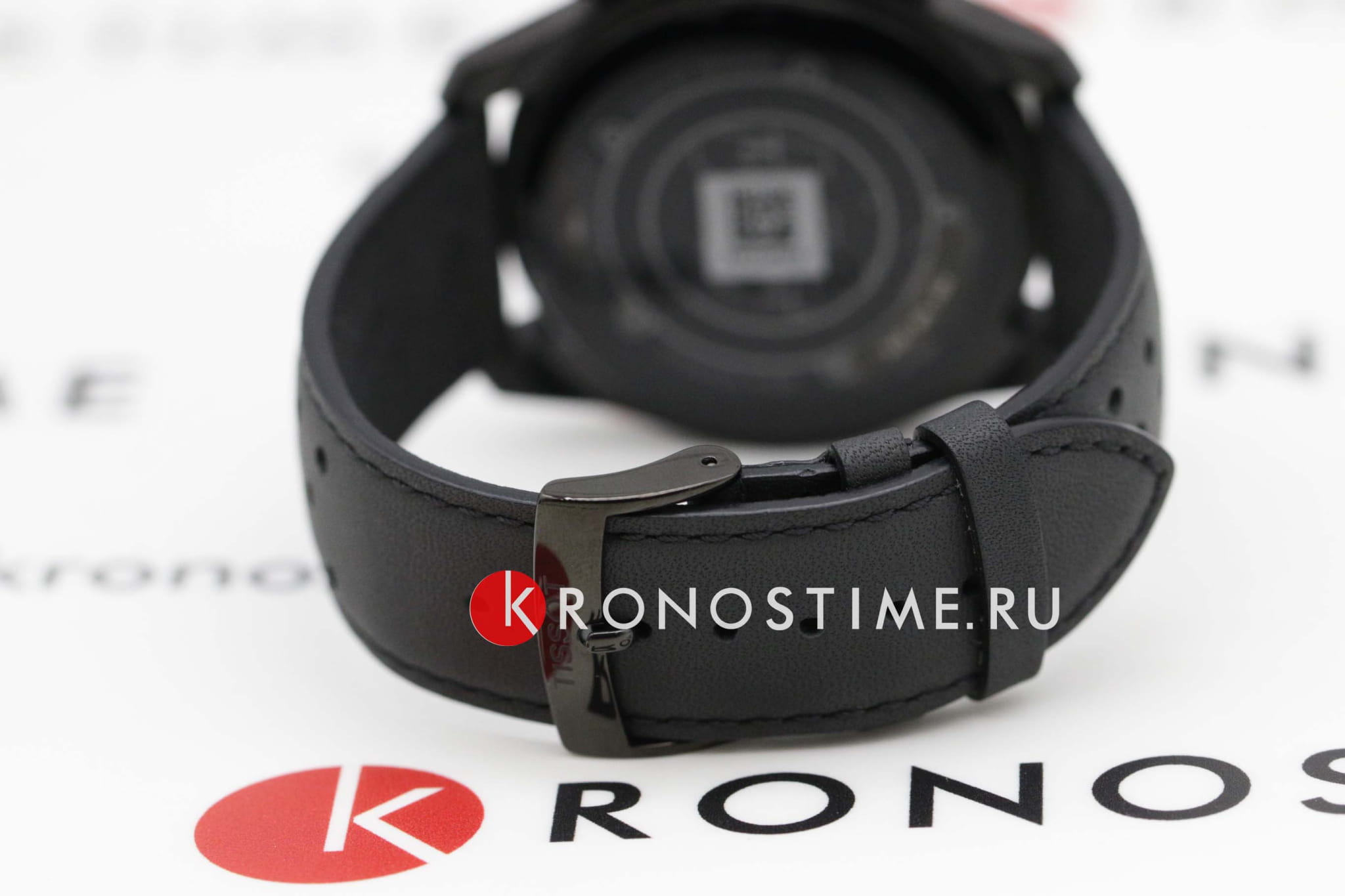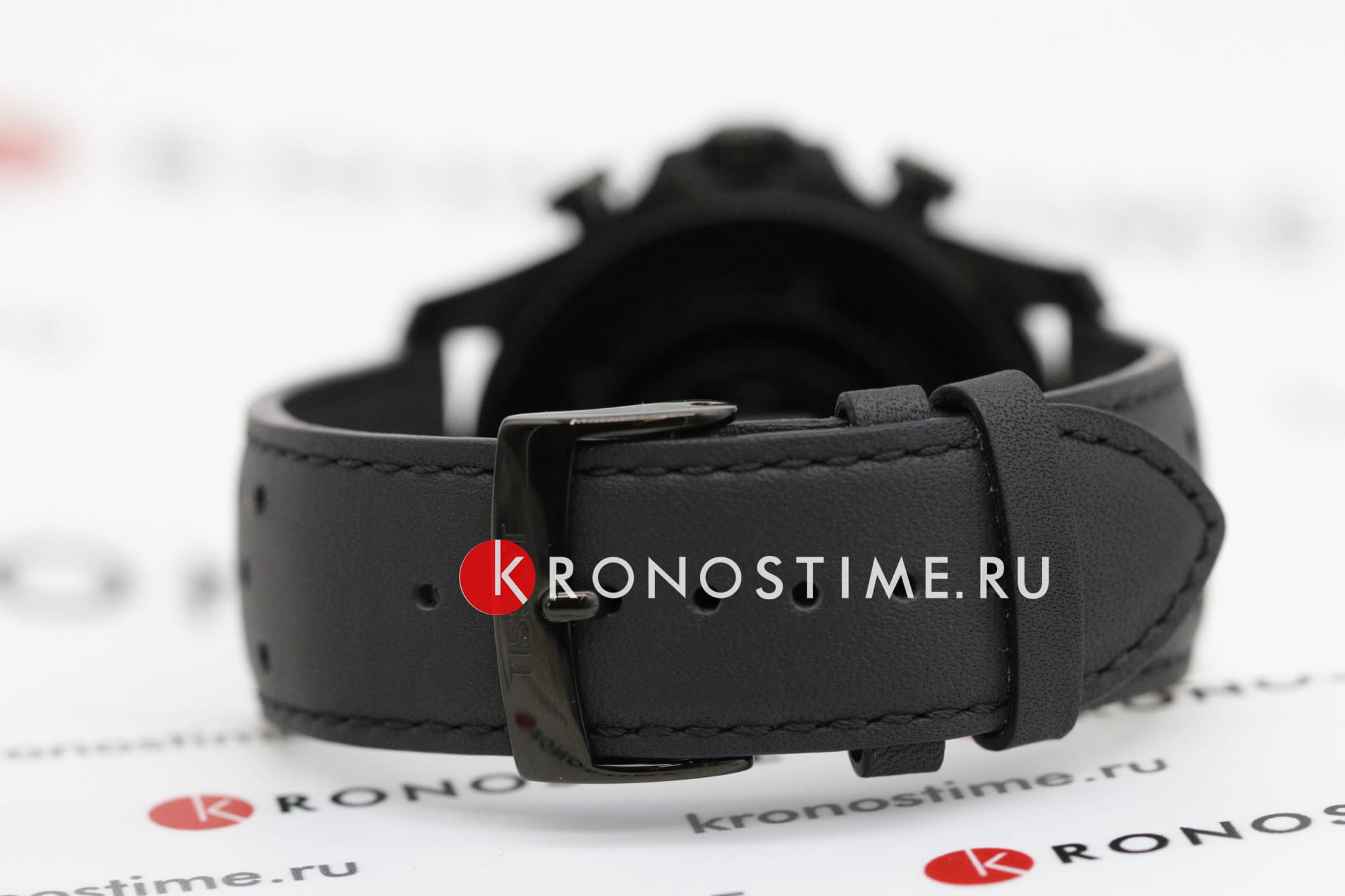 Стильный аксессуар полностью выполнен в чёрном цвете, исключение составляют лишь серебристые часовые метки и стрелки, а также ободок счётчиков хронографаХронографФункция позволяет измерять отрезки времени с особой точностью: часы, минуты, секунды. Верным признаком хронографа является наличие на циферблате 3 дополнительных окошек-счётчиков.. Подобный дизайн считается универсальным, что делает возможным носить часы с любой одеждой. Кварцевый механизм ETA G10.212. PVD-покрытиеPVDУльтратонкое покрытие наносится в технике вакуумного напыления, сочетает в себе нитрид титана особой прочности со слоем золота или оксида хрома. Несёт в себе декоративную или защитную функцию. корпуса. Люминесцентная подсветкаЛюминесцентное покрытиеПозволяет считывать показания времени в темноте. Производители наносят на стрелки, часовые индексы, безель или поверхность циферблата светонакопительный состав, дающий холодное свечение.. Опции: секундомер, тахиметрТахиметрРазмеченная шкала, располагается на ободке или безеле часов. Тахиметр позволяет рассчитать скорость на определённом участке пути, расстояние измеряется в километрах или милях., индикация даты. Габариты: 42,5 x 42,5 x 11,2 мм.
