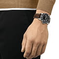 Корпус выполнен из нержавеющей стали 316L и оснащён безелемБезельВнешний ободок, закрепляющий стекло. В спортивных часах так называется поворотное кольцо с делениями на циферблате, выполняет роль таймера – замеряет отрезки времени на шкале. Неподвижный безель – элемент декора. Однонаправленно вращающийся безель на дайверских часах позволяет фиксировать моменты погружения и выныривания на поверхность. с алюминиевой вставкой, что придаёт модели динамичный характер. Сапфировое стеклоСапфировое стеклоПрочный и надёжный материал из кристалла сапфира синтетического происхождения, характеризующийся особой твёрдостью и устойчивостью к царапинам и повреждениям. защищает чёрный циферблат от повреждений и обеспечивает идеальную читаемость.