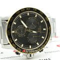 Современный хронографХронографФункция позволяет измерять отрезки времени с особой точностью: часы, минуты, секунды. Верным признаком хронографа является наличие на циферблате 3 дополнительных окошек-счётчиков. поможет подчеркнуть продуманный образ делового мужчины. Модель выполнена в спокойной серебристо-чёрной расцветке. Наручные часы функционируют благодаря швейцарскому кварцевому механизму ETA G10.212. Калибр отличается максимальной точностью хода. Стекло из сапфира. Водостойкость 100 метров. Надёжный корпус из антикоррозионной стали 316L с жёлтым PVD-покрытиемPVDУльтратонкое покрытие наносится в технике вакуумного напыления, сочетает в себе нитрид титана особой прочности со слоем золота или оксида хрома. Несёт в себе декоративную или защитную функцию.. Люминесцентная подсветкаЛюминесцентное покрытиеПозволяет считывать показания времени в темноте. Производители наносят на стрелки, часовые индексы, безель или поверхность циферблата светонакопительный состав, дающий холодное свечение. стрелок и индексов. Секундомер, отображение даты. Диаметр корпуса: 45,5 мм.
