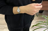 Дизайнеры реализуют свои идеи в оригинальном оформлении браслетов, центральные звенья цвета "розовое золото" приковывают взгляды. Интерес представляет также перламутровый циферблат компактного размера, благодаря этому часы красиво смотрятся на изящном женском запястье. Кварцевый механизм ETA F03.111. PVD-покрытие корпуса и браслета. Водонепроницаемость 100 метров.  Габариты: 26 x 26 x 6,9 мм.