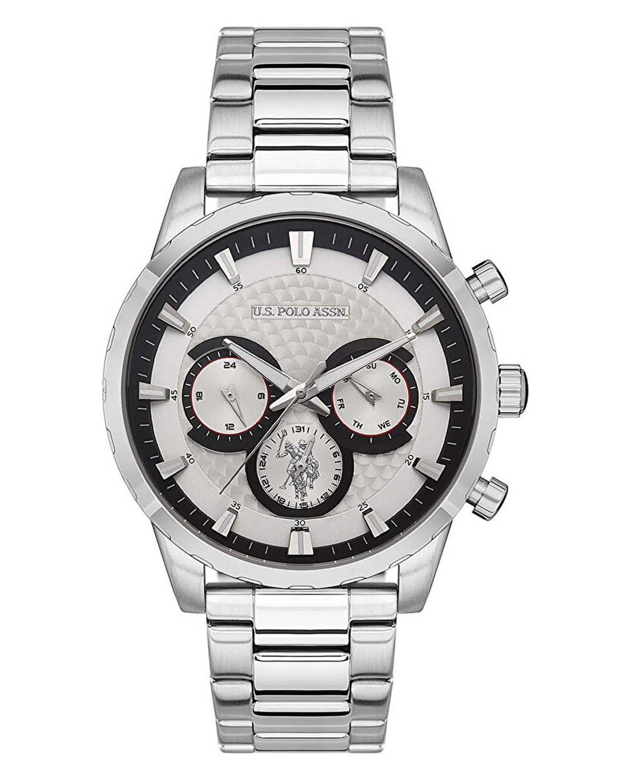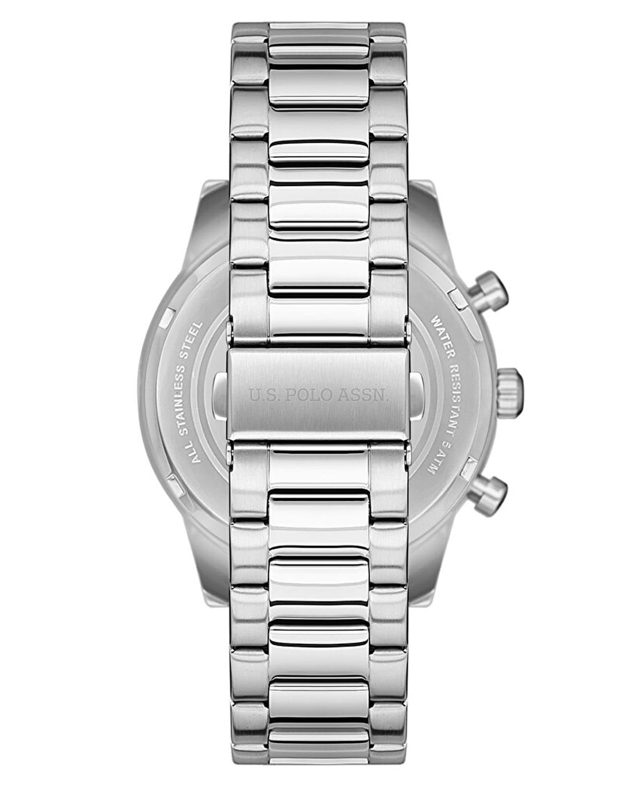 Мужские часы U.S. Polo Assn Crossing USPA1055-01, кварцевый механизм с высокой точностью. Минеральное стеклоМинеральное стеклоМинеральное стекло представляет собой искусственно выращенный минерал кварца. Такое стекло отличается особой устойчивостью к повреждениям и царапинам. Уступает по некоторым качествам сапфировому стеклу. устойчивое к появлению царапин, обладающее высокой прозрачностью. Корпус изготовлен из нержавеющей стали. Центральные часовая, минутная и секундная стрелки. Индикация даты и дня недели. 12/24х часовой формат времени. Стрелки и метки с люминесцентным покрытиемЛюминесцентное покрытиеПозволяет считывать показания времени в темноте. Производители наносят на стрелки, часовые индексы, безель или поверхность циферблата светонакопительный состав, дающий холодное свечение.. Класс водозащиты: 50 метров, позволит защитить корпус от случайных брызг или капель дождя. Стальной браслет на раскладной застёжкеРаскладная застёжкаТакой тип застёжки используется только на браслетах из металла. Она никогда не раскрывается полностью, происходит разделение на 2 и более частей. Раскладывающая застёжка снизит вероятность потери часов к минимуму..
