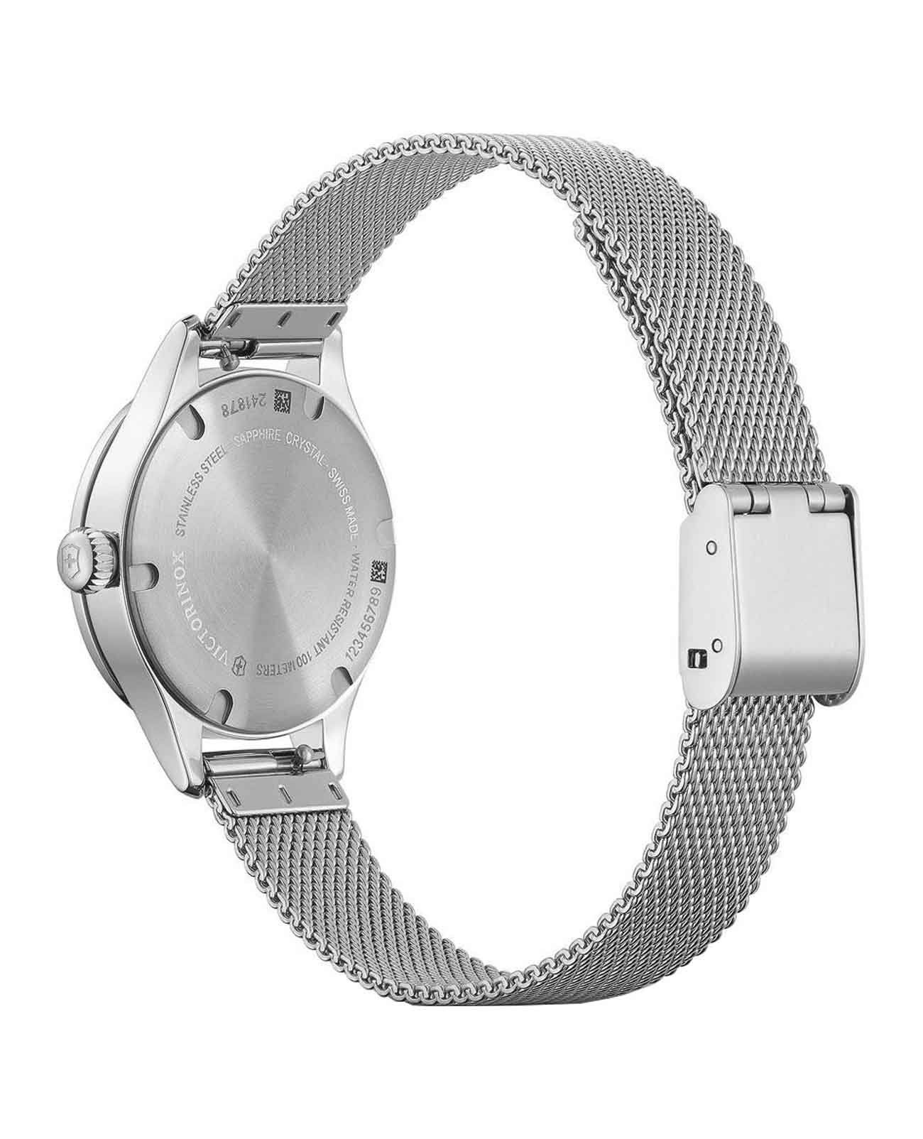 Женские часы Victorinox ALLIANCE XS 241878 с надёжным кварцевым механизмом. Корпус выполнен из нержавеющей стали. Циферблат инкрустирован кристаллами Swarovski. Стрелки и метки с люминесцентным покрытиемЛюминесцентное покрытиеПозволяет считывать показания времени в темноте. Производители наносят на стрелки, часовые индексы, безель или поверхность циферблата светонакопительный состав, дающий холодное свечение.. Класс водозащиты: 100 метров, позволит плавать, нырять и заниматься другими водными видами спорта. Стальной браслет миланского плетения на раскладном замкеРаскладной замокДанный вариант застежки используется только на часах с металлическим браслетом. Отличительная особенность такого крепления в том, что длина браслета становится универсальной и вы можете самостоятельно отрегулировать нужный вам размер – застежка просто двигается по браслету часов..