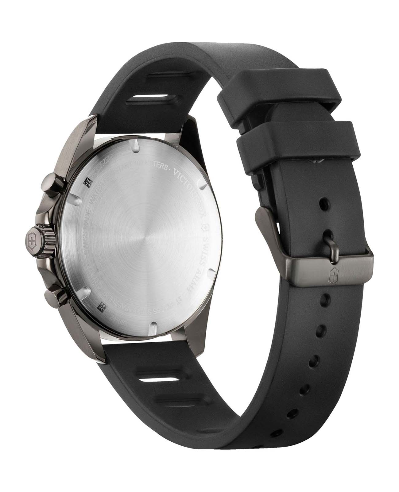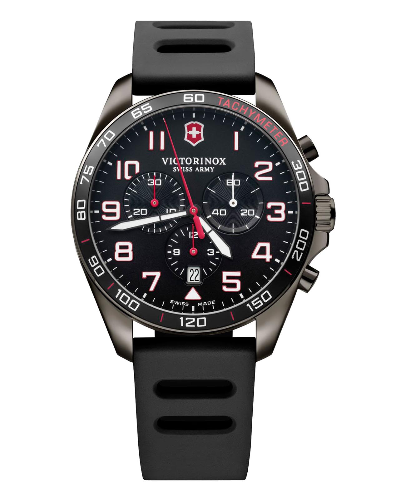 Мужские швейцарские часы-хронографХронографФункция позволяет измерять отрезки времени с особой точностью: часы, минуты, секунды. Верным признаком хронографа является наличие на циферблате 3 дополнительных окошек-счётчиков. Victorinox Fieldforce Sport Chronograph 241889 с надёжным кварцевым механизмом. Сапфировое стеклоСапфировое стеклоПрочный и надёжный материал из кристалла сапфира синтетического происхождения, характеризующийся особой твёрдостью и устойчивостью к царапинам и повреждениям. с трёхслойным антибликовым покрытием. Корпус часов выполнен из нержавеющей стали с PVD-покрытиемPVDУльтратонкое покрытие наносится в технике вакуумного напыления, сочетает в себе нитрид титана особой прочности со слоем золота или оксида хрома. Несёт в себе декоративную или защитную функцию..БезельБезельВнешний ободок, закрепляющий стекло. В спортивных часах так называется поворотное кольцо с делениями на циферблате, выполняет роль таймера – замеряет отрезки времени на шкале. Неподвижный безель – элемент декора. Однонаправленно вращающийся безель на дайверских часах позволяет фиксировать моменты погружения и выныривания на поверхность. с метками тахиметраТахиметрРазмеченная шкала, располагается на ободке или безеле часов. Тахиметр позволяет рассчитать скорость на определённом участке пути, расстояние измеряется в километрах или милях.. Окошко даты находится в положении 6 часов, стрелки и метки с люминесцентным покрытиемЛюминесцентное покрытиеПозволяет считывать показания времени в темноте. Производители наносят на стрелки, часовые индексы, безель или поверхность циферблата светонакопительный состав, дающий холодное свечение.. Класс водозащиты: 100 метров, позволит плавать, нырять и заниматься другими водными видами спорта. Практичный резиновый ремешок на стандартной застёжке.