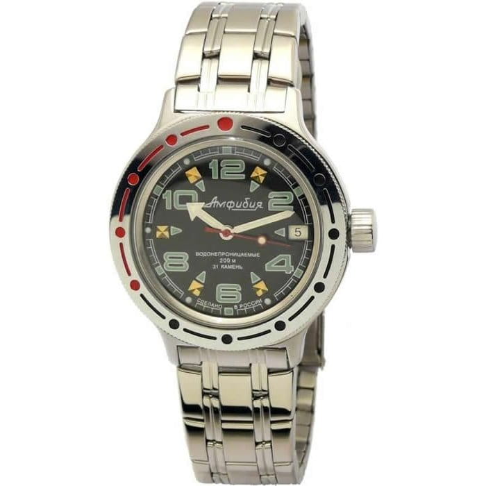 Наручные механические Часы Восток Амфибия Классика 420334. Механизм 2416 с автоподзаводом. Автоподзавод обеспечивает отсутствие необходимости завода наручных часов при постоянном ношении. Запас хода при полном заводе, не менее 31 час. Также есть ручной завод, можно вручную завести часы, если их не носили какое-то время до этого. Завинчивающаяся заводная головка из стали. Водозащита 200 метров позволяет использовать для занятий дайвингом. Корпус изготовлен из высококачественной нержавеющий стали.Противоударное устройство оси баланса. Браслет с раскладывающейся застежкой.