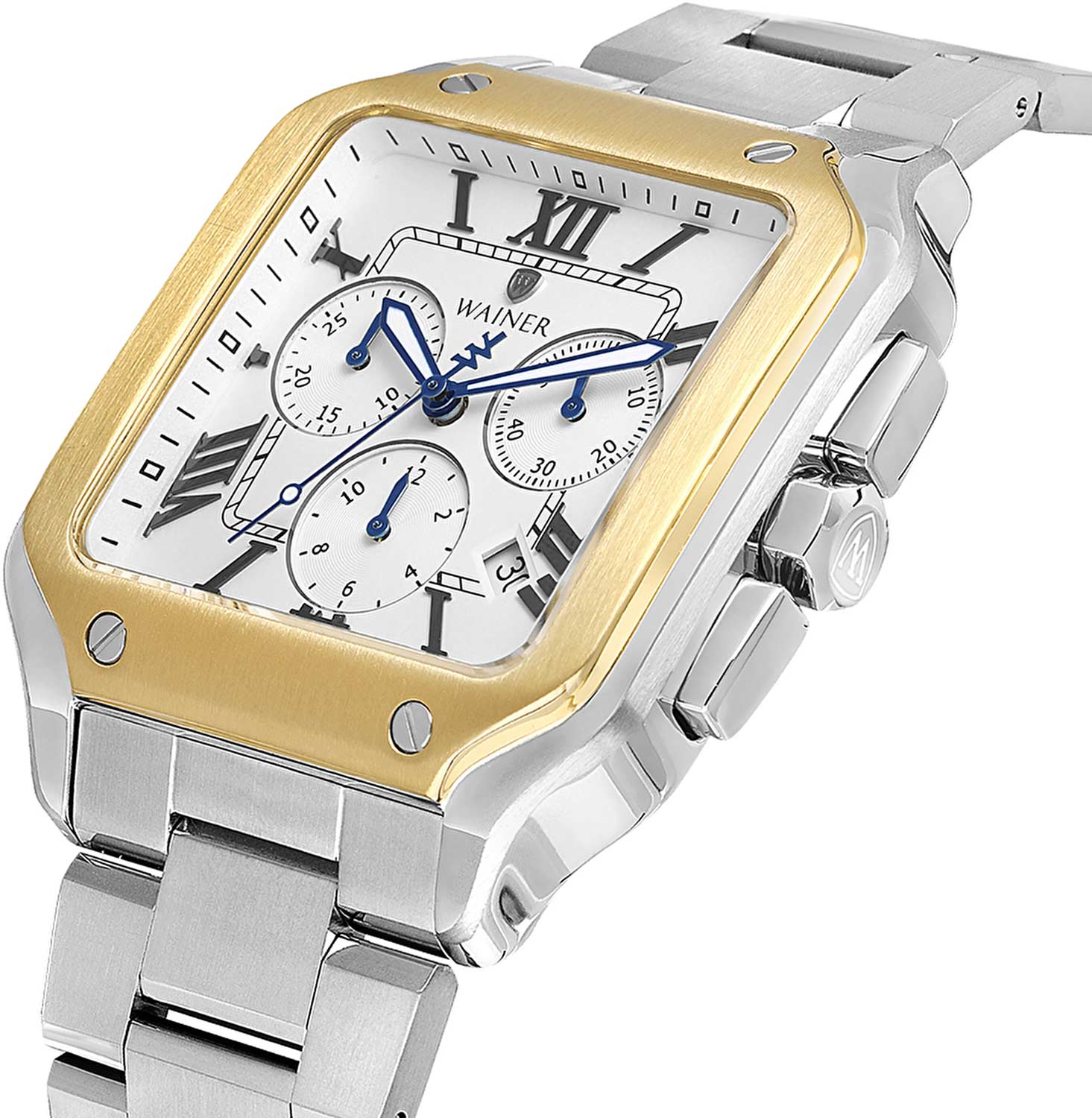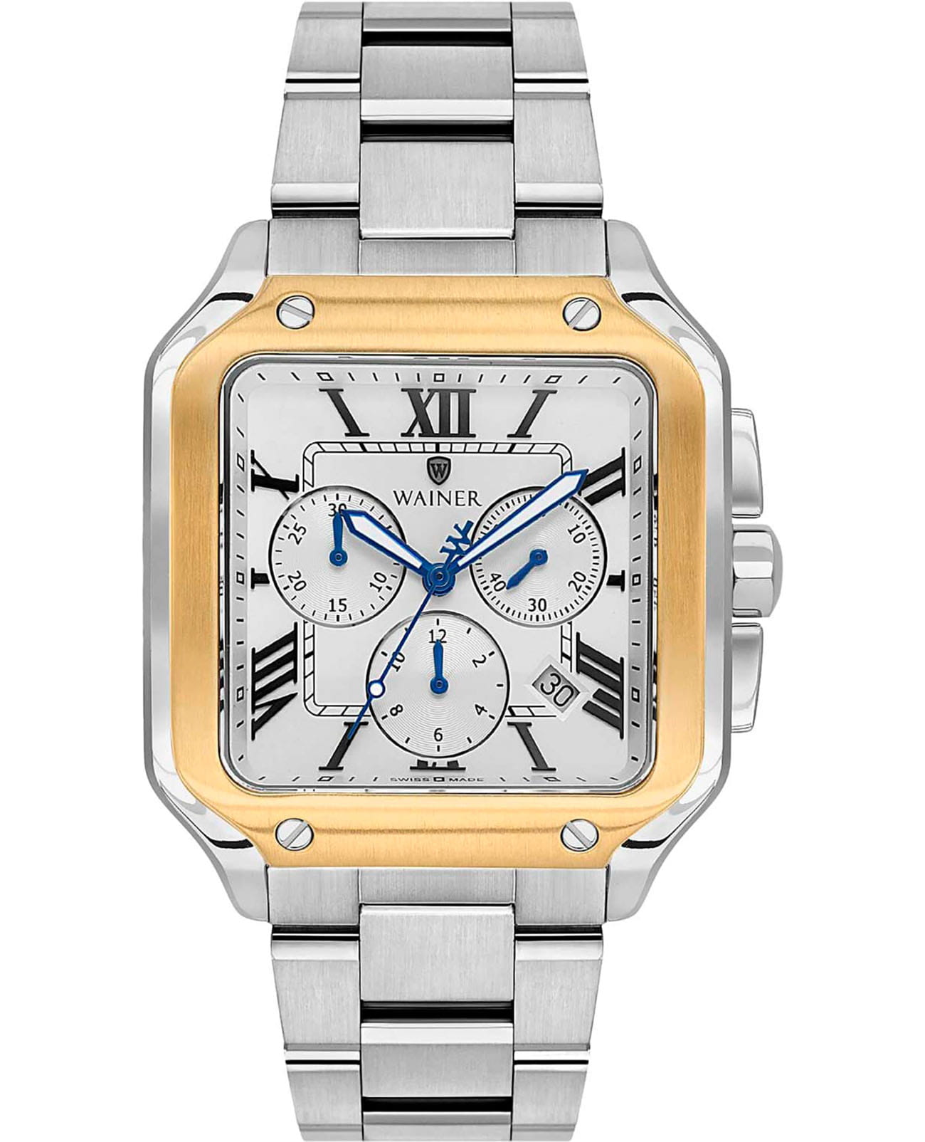 Мужские кварцевые часы Wainer WA.18090-E — это стильный аксессуар, сочетающий в себе швейцарское качество и изысканный дизайн. Модель выполнена в квадратной форме из стали 316L с частичным PVD-покрытиемPVDУльтратонкое покрытие наносится в технике вакуумного напыления, сочетает в себе нитрид титана особой прочности со слоем золота или оксида хрома. Несёт в себе декоративную или защитную функцию., что придаёт ей благородный внешний вид и устойчивость к царапинам. Корпус украшен декоративными винтами, подчёркивая внимание к деталям. Циферблат белого цвета дополнен штриховыми метками и римскими цифрами, а секундная стрелка на конце декорирована буквой W, добавляя модели индивидуальности. Защиту механизма обеспечивает сапфировое стеклоСапфировое стеклоПрочный и надёжный материал из кристалла сапфира синтетического происхождения, характеризующийся особой твёрдостью и устойчивостью к царапинам и повреждениям., устойчивое к повреждениям. Окошко даты расположено в положении 4 часов, а гранёная заводная головка с защитой оснащена фирменным логотипом. Браслет из стали 316L шириной 22 мм оснащён Раскладная застёжкаРаскладная застёжкаТакой тип застёжки используется только на браслетах из металла. Она никогда не раскрывается полностью, происходит разделение на 2 и более частей. Раскладывающая застёжка снизит вероятность потери часов к минимуму., обеспечивающей комфорт и надёжную фиксацию на запястье. Водонепроницаемость позволяет использовать модель при мытье рук или под лёгким дождём. Стрелки с люминесцентным покрытиемЛюминесцентное покрытиеПозволяет считывать показания времени в темноте. Производители наносят на стрелки, часовые индексы, безель или поверхность циферблата светонакопительный состав, дающий холодное свечение. обеспечивают отличную читаемость даже в условиях слабого освещения. Механизм калибра Ronda 5030.D гарантирует точность хода и надёжность. Эти часы станут универсальным аксессуаром для тех, кто ценит сочетание стиля, функциональности и швейцарского мастерства — идеальный выбор для повседневной носки и торжественных случаев.