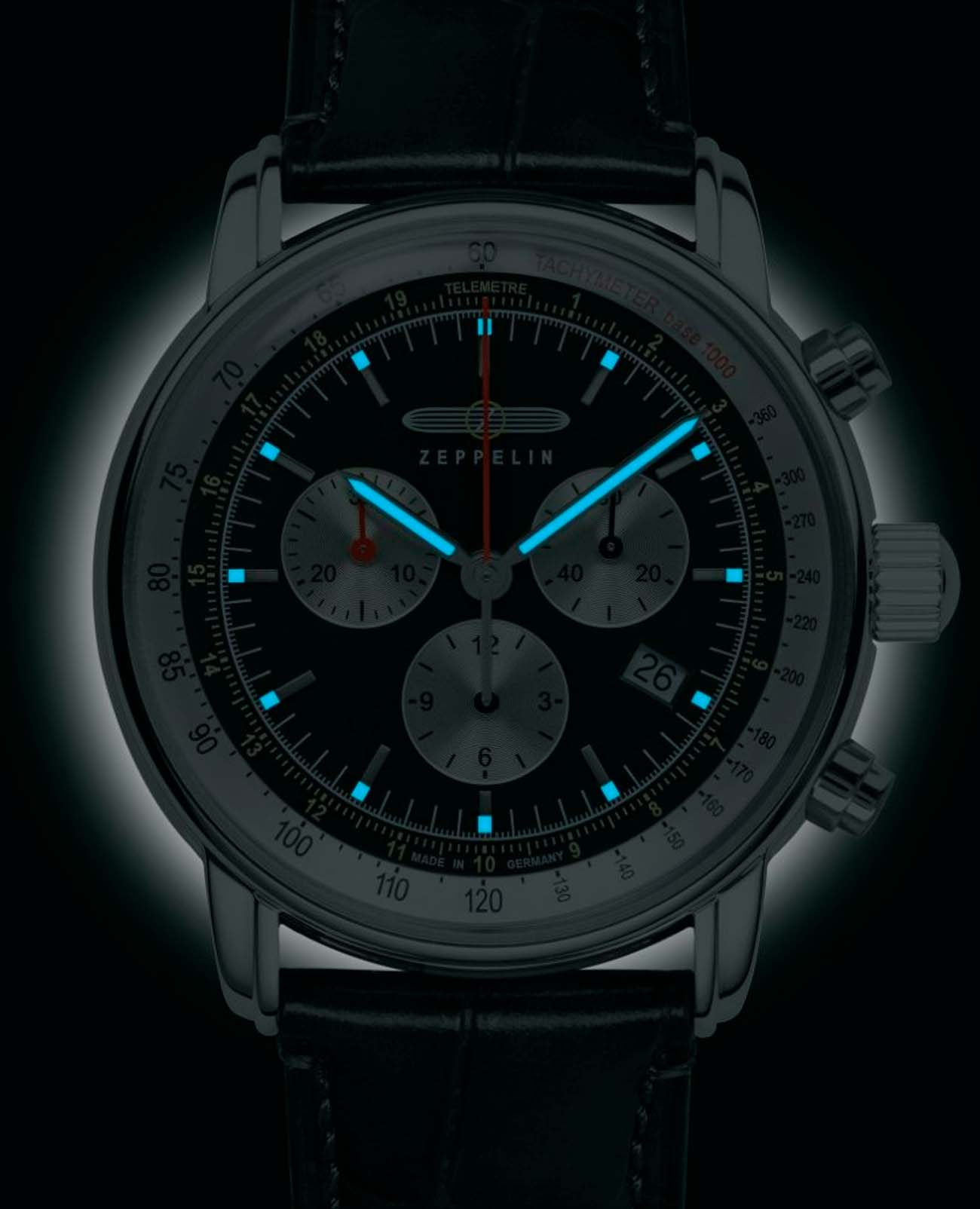 Мужские наручные часы-хронографХронографФункция позволяет измерять отрезки времени с особой точностью: часы, минуты, секунды. Верным признаком хронографа является наличие на циферблате 3 дополнительных окошек-счётчиков. Zeppelin 88883 из коллекции LZ14 Marine сочетают в себе классический дизайн и надежность современных технологий. Модель обладает круглым корпусом диаметром 42 мм, изготовленным из нержавеющей стали, что обеспечивает высокую устойчивость к внешним воздействиям. Браслет выполнен из натуральной кожи, гарантирующей комфортное ношение и безопасность. Темно-синий циферблат с серебристыми светящимися индексами и люминесцентнымиЛюминесцентное покрытиеПозволяет считывать показания времени в темноте. Производители наносят на стрелки, часовые индексы, безель или поверхность циферблата светонакопительный состав, дающий холодное свечение. стрелками оснащен окном даты на «4 часах». Для защиты используется минеральное стеклоМинеральное стеклоМинеральное стекло представляет собой искусственно выращенный минерал кварца. Такое стекло отличается особой устойчивостью к повреждениям и царапинам. Уступает по некоторым качествам сапфировому стеклу., обеспечивающее прочную защиту от царапин. Часы работают на кварцевом механизме Ronda 5030.D швейцарского производства, что гарантирует точное время без необходимости подзаводки. Модель также является хронографом, оснащенным функцией секундомераСекундомерСекундоме́р — прибор, способный измерять интервалы времени с точностью до долей секунды., а также дополнительным циферблатом малых секунд и тахиметрической шкалой, делая ее идеальной для активного образа жизни. Водонепроницаемость часов достигает 5 атмосфер (50 метров), что позволяет использовать их во время плавания на поверхности, однако не рекомендуется для глубоководного дайвинга или занятий водными видами спорта с высоким уровнем активности.